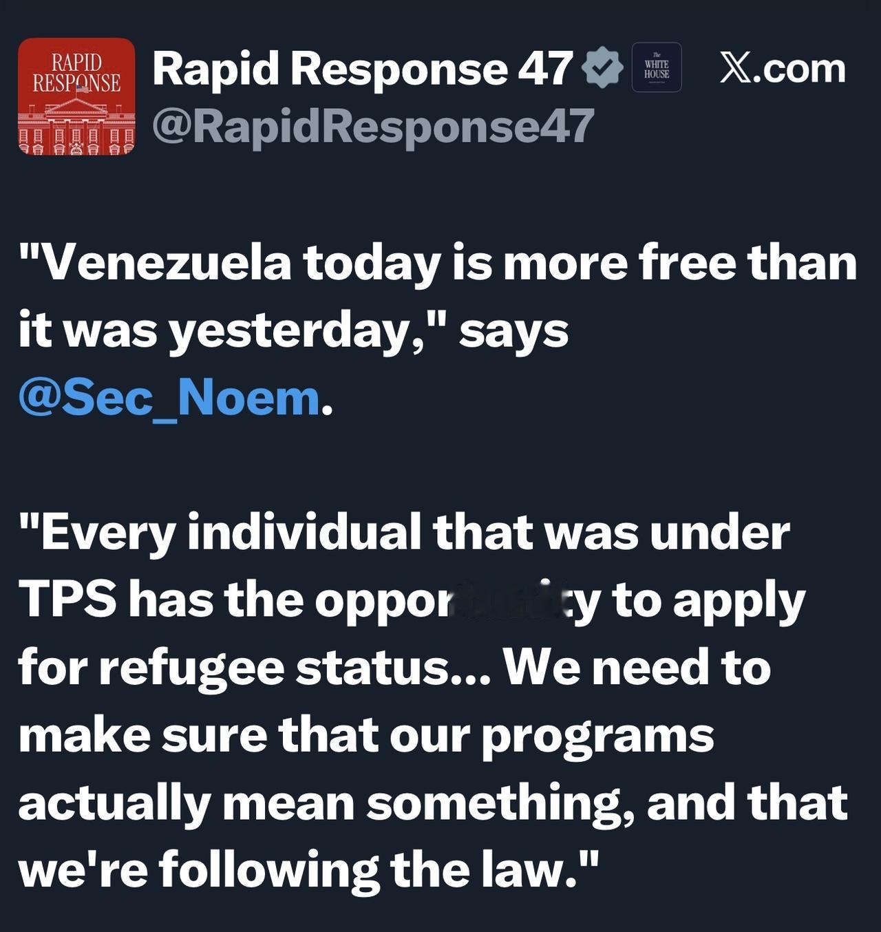 “今天的委内瑞拉比昨天更加自由,” 美国国土安全部部长诺姆说道。 “每个曾持有临时保护身份的人都有机会申请难民身份……我们需要确保我们的项目真正发挥作用,并且我们遵守法律。”
