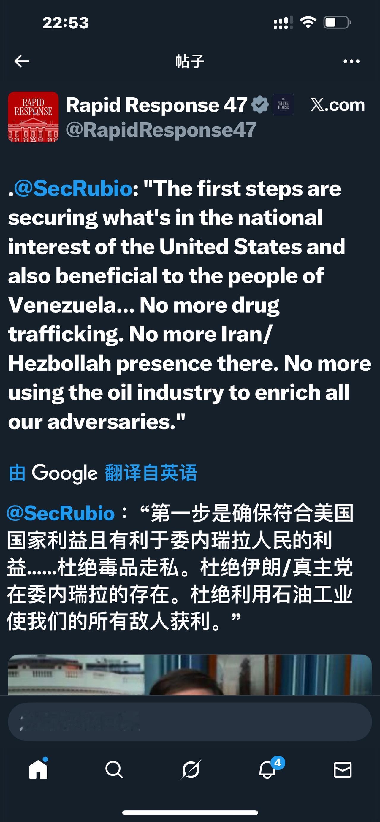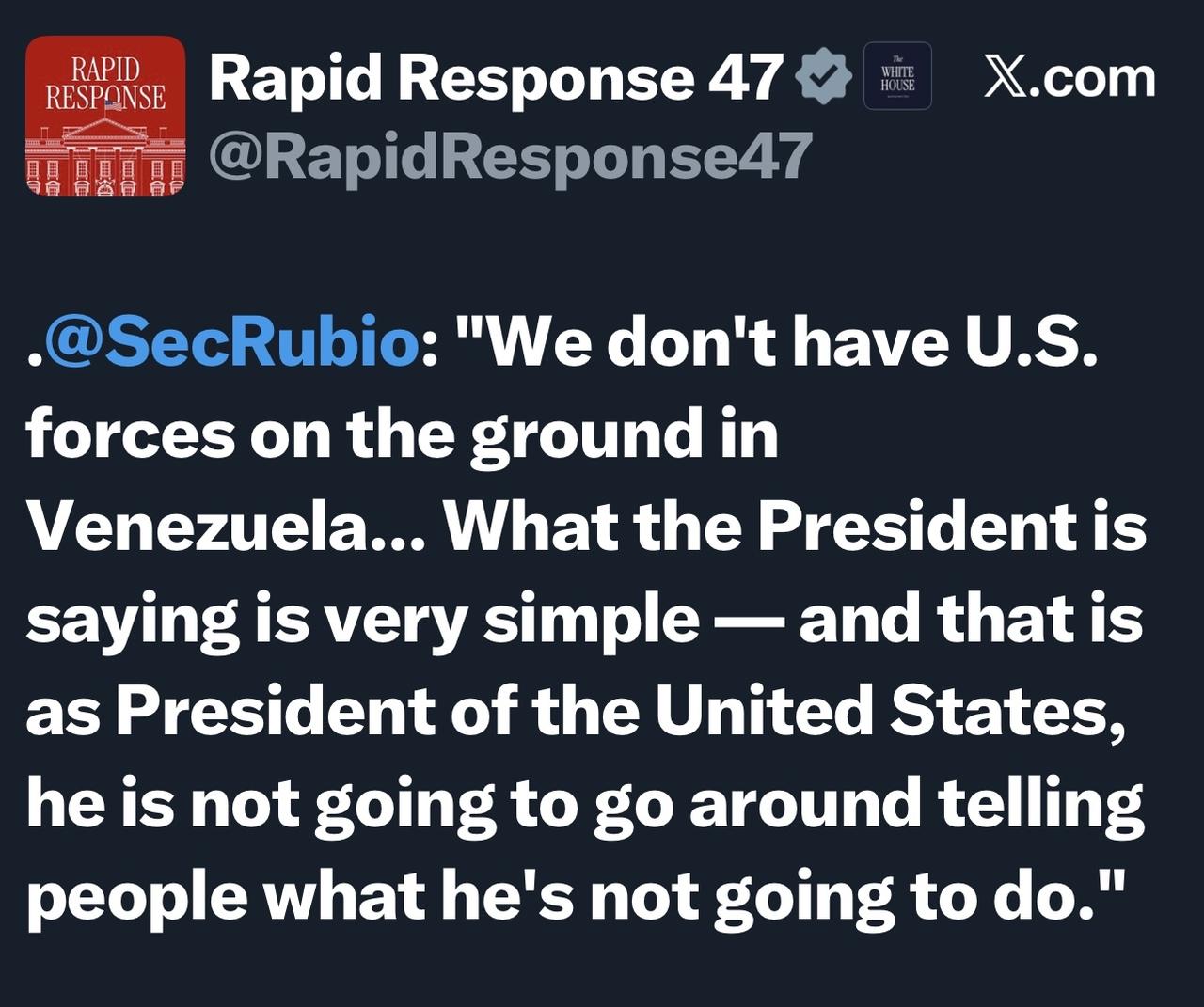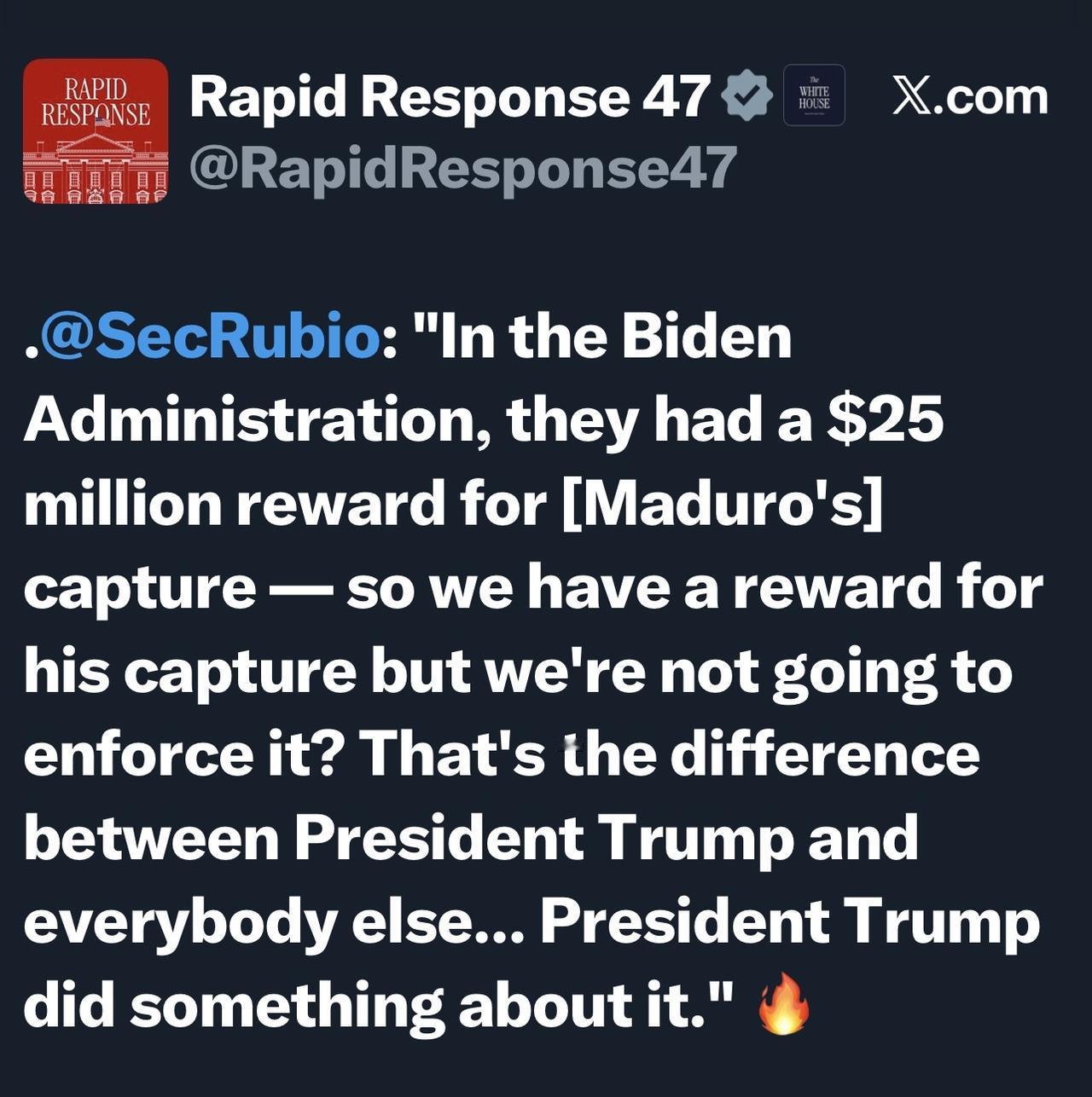 美国国务卿卢比奥: “第一步是确保符合美国国家利益且有利于委内瑞拉人民的利益……杜绝毒品走私。杜绝伊朗/真主党在委内瑞拉的存在。杜绝利用石油工业使我们的所有敌人获利。” “我们没有美军驻扎在委内瑞拉……总统的意思很简单——作为美国总统,他不会到处告诉人们他不会做什么。” “拜登政府悬赏2500万美元捉拿马杜罗——所以我们也有悬赏捉拿他,却不打算执行?这就是特朗普总统和其他人的区别……特朗普总统采取了行动。” 🔥