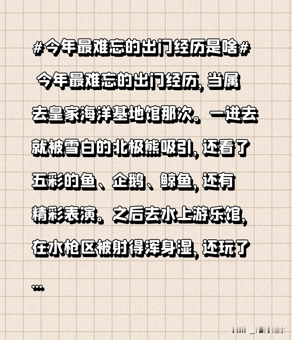 今年最难忘的出门经历,当属去皇家海洋基地馆那次。一进去就被雪白的北极熊吸引,还看了五彩的鱼、企鹅、鲸鱼,还有精彩表演。之后去水上游乐馆,在水枪区被射得浑身湿,还玩了刺激的“吊死鬼”,超难忘!
