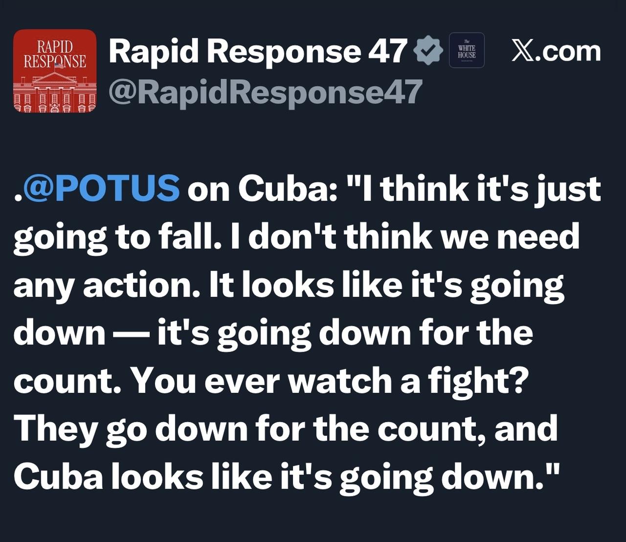 特朗普谈到古巴时说:“我认为它就要垮了。我认为我们不需要采取任何行动。它看起来正在走向毁灭——彻底垮台了。你看过拳击比赛吗?他们都会倒下,古巴看起来也一样。 会倒下。”