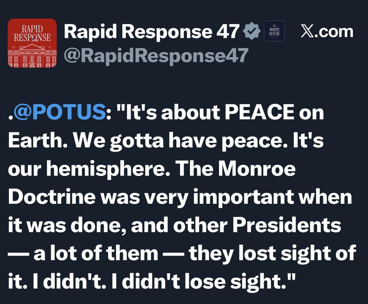 特朗普:“这关乎地球和平。我们必须拥有和平。这是我们的半球。门罗主义在当时非常重要,但其他总统——很多总统——都忘记了它。我没有。我没有忘记。”