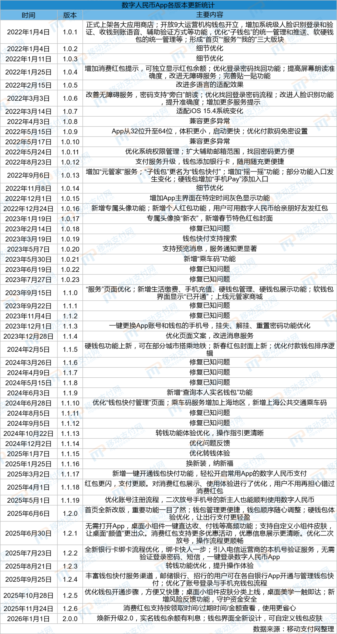据移动支付网统计,数字人民币App上架4年以来,进行了51次迭代更新,其中2022年16次,2023年12次,2024年10次,2025年12次,2026年1次,目前其处于2.0.0版本。不过,数字人民币运营管理中心透露的是“从版本1.0.0到版本2.0.0.共历经54次迭代更新”,与移动支付网统计的数据略有差异。