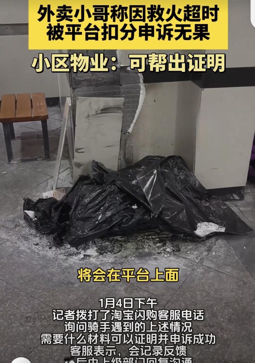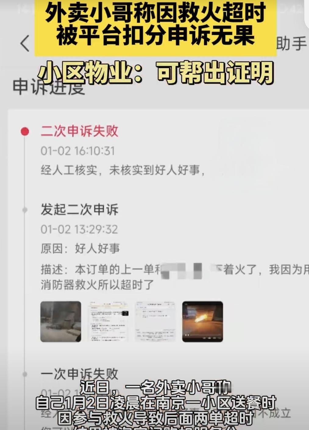 1月2日凌晨,南京一名外卖骑手在送餐途中发现小区楼栋起火,他立即呼喊保安并协助灭火,前后耗时约10分钟。因救火导致后续两单超时,骑手被淘宝闪购平台扣除服务分,他两次提交着火现场照片等证据申诉,却因“未核实到好人好事”被驳回。骑手无奈在网络平台发帖求助,引发网友关注。 事发小区物业证实,起火点位于架空层,燃烧物为大件快递,疑因烟头引发,幸未造成人员伤亡。物业经理表示,骑手发现火情后第一时间通知保安,避免了火势蔓延,物业和业主均想寻找骑手致谢,并愿意为其出具证明。 舆论发酵后,平台于1月4日晚回应称,经重新核查确认骑手行为属实,已撤销扣分处罚,并授予其“城市骑士社区侠”荣誉称号及1000元现金奖励。平台承认此前客服审核尺度不当,承诺优化申诉机制,避免类似事件寒了好人心。 此事折射出外卖行业“效率至上”规则与见义勇为行为的冲突。骑手为救火牺牲个人利益,却因平台机械审核机制陷入维权困境,暴露出部分平台对特殊情境的应对不足。若非舆论推动,骑手的善举可能被“系统”忽视,甚至因扣分影响收入,这无疑会削弱公众对见义勇为的信心。 值得肯定的是,平台最终正视问题并给予奖励,传递了“善行应被善待”的积极信号。但更需反思的是,如何建立更人性化的规则体系——例如为见义勇为设置免责条款、简化申诉流程,或与社区、消防部门联动核实事件真实性,让“做好事不吃亏”成为制度保障。 见义勇为是社会文明的温度计,平台作为连接千万骑手与用户的桥梁,既要维护规则公平,更应守护人性温暖。唯有让机制设计更包容、更灵活,才能让更多人在关键时刻敢于挺身而出,让善意不被“系统”误伤。 你认为平台对于外卖骑手的制度是否太严?欢迎来评论区讨论。