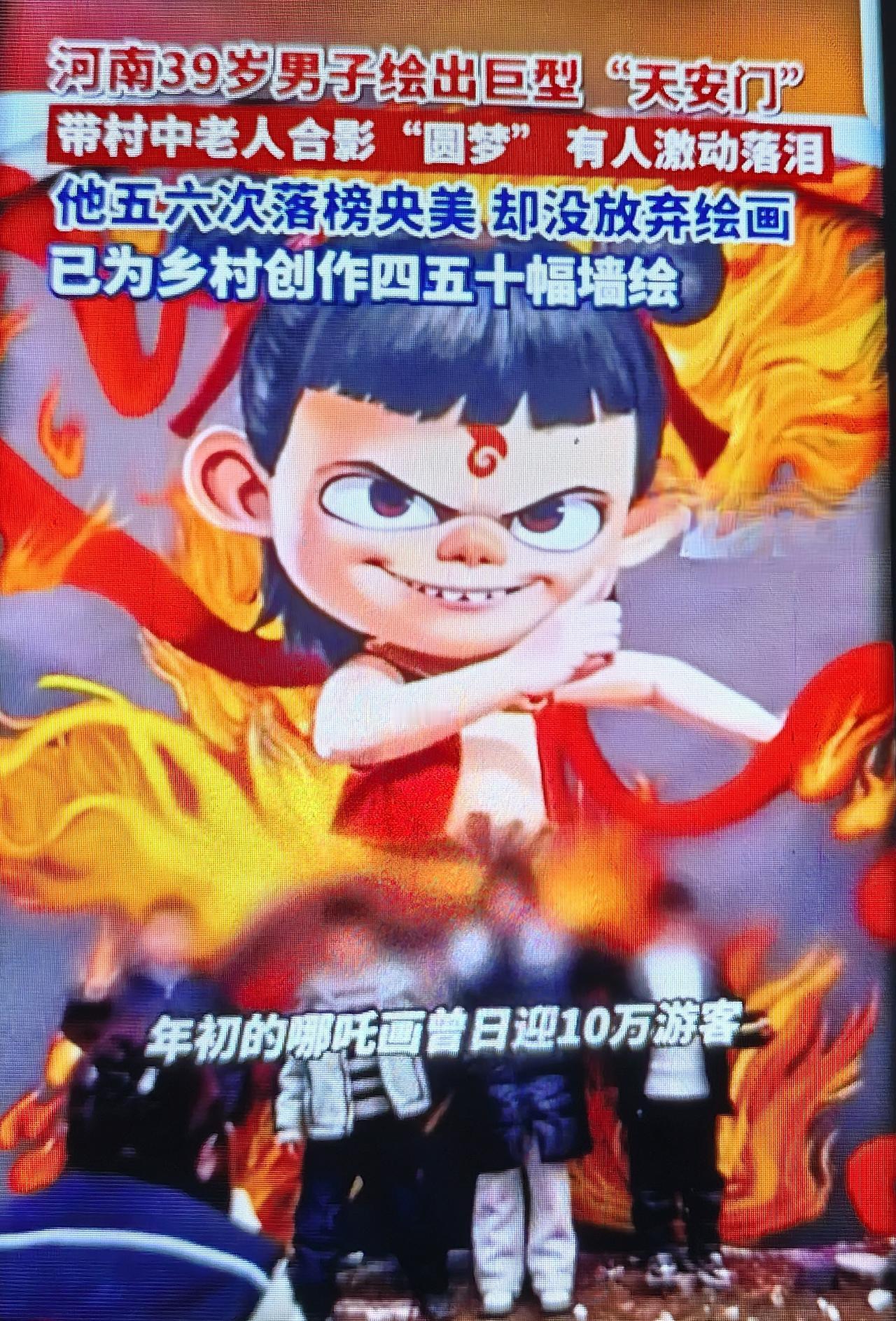 河南商丘39岁的农民画家吴承言最近火出圈了!他耗时5天在村头画了幅18米长、8米高的巨型天安门墙绘,逼真程度让游客直呼“仿佛到了北京”。元旦假期,村里单日涌入超10万人,摊贩一天营业额超2万,连央媒都发文点赞。 可谁能想到,这位“网红画家”曾5次报考中央美院,专业全国第六却因英语拖后腿落榜;和妻子经营幼儿园亏损后,至今还背着债。但他没抱怨,反而把画笔转向乡村,用墙绘帮老人圆梦——哪吒、长城、橘子洲头……40多幅作品里,藏着他对这片土地的深情。 最戳人的是那幅天安门墙绘。村里老人一辈子没出过远门,“去北京看天安门”是藏在心底的夙愿。吴承言听在耳里,记在心上,踩着脚手架画了5天,连国徽都一笔不敢马虎。画成那天,老人们换上新衣来合影,有人激动得热泪盈眶:“这辈子没遗憾了。” 有人说他是“失败者逆袭”,可我觉得,他从未失败过。落榜没浇灭他对绘画的热爱,债务没阻止他为乡亲付出。他用画笔证明:艺术不在殿堂,而在村民的笑容里;成功不在名校,而在脚踏实地的坚持里。 乡村振兴需要这样的“乡土艺术家”——不靠流量炒作,只凭真心实意。吴承言的故事告诉我们:只要心里有光,平凡的村子也能成为“诗和远方”。 你认为吴承言是失败者,还是人生赢家,欢迎来评论区讨论。