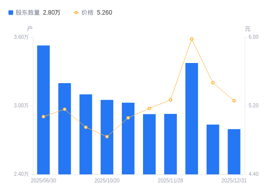 近一年(2024年12月31日至2025年12月31日),鹏翎股份A股股东户数从3.21万户,减低至2.8万户,降幅13.01%,区间股价上涨11.11%。