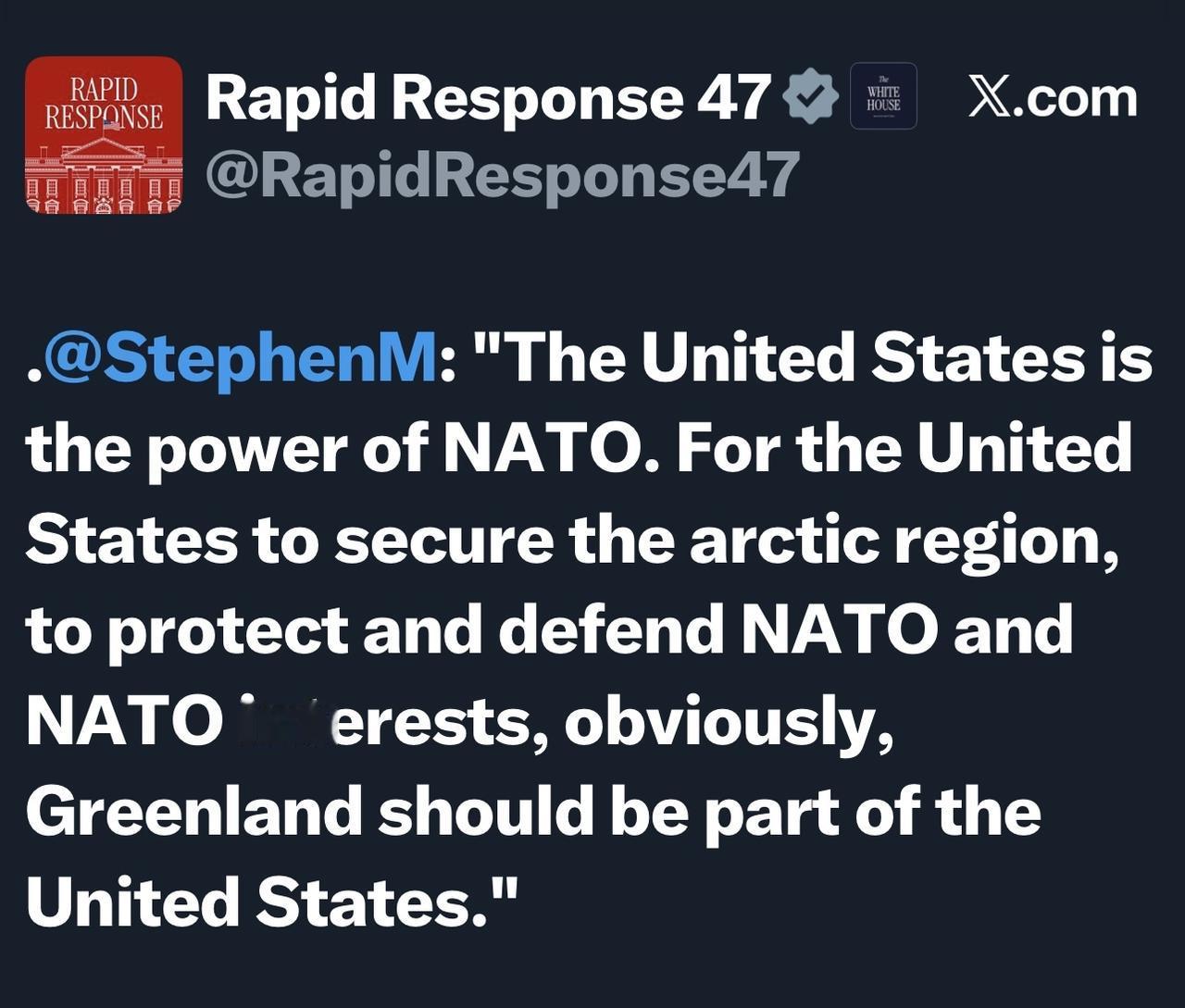 厚颜无耻 白宫副幕僚长史蒂芬.米勒:“美国是北约的力量。为了确保北极地区的安全,保护和捍卫北约及其利益,格陵兰岛显然应该成为美国的一部分。”