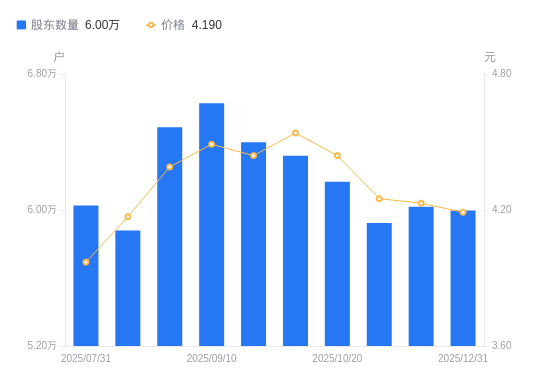 日期A股户数(户)流通A股户均持股数(股)户均持股市值(万元)2025-12-315996824021.4010.062025-12-106019723930.0210.122025-11-285923524318.6410.342025-10-206165623363.7410.372025-09-306318422798.7310.352025-09-196399022511.5610.002025-09-106628221733.129.762025-08-296486922206.529.752025-08-205880124498.1310.222025-07-316026223904.209.49