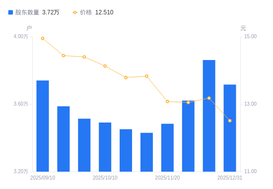 日期A股户数(户)流通A股户均持股数(股)户均持股市值(万元)2025-12-31371644773.655.972025-12-19386164594.166.062025-12-10362154898.746.392025-11-20348415091.936.662025-11-10343025171.947.152025-10-20345125140.477.092025-10-10349125081.587.182025-09-30351375049.047.272025-09-19358754945.177.142025-09-10374084742.527.09