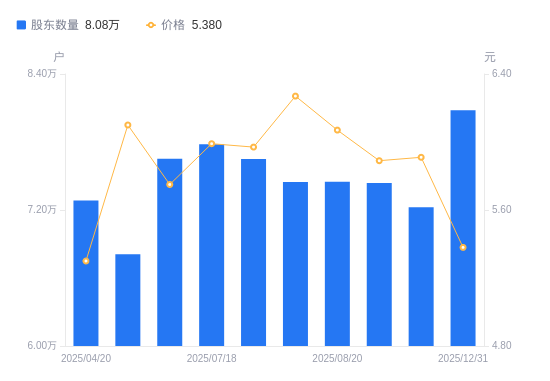 日期A股户数(户)流通A股户均持股数(股)户均持股市值(万元)2025-12-318079342496.2222.862025-11-287224847522.3828.092025-09-307439246152.7727.182025-08-207448346096.3927.982025-08-087448146097.6328.902025-07-317650644877.4926.792025-07-187780644127.6726.432025-06-307652544866.3525.802025-05-306809550420.6530.762025-04-207283847137.4024.98