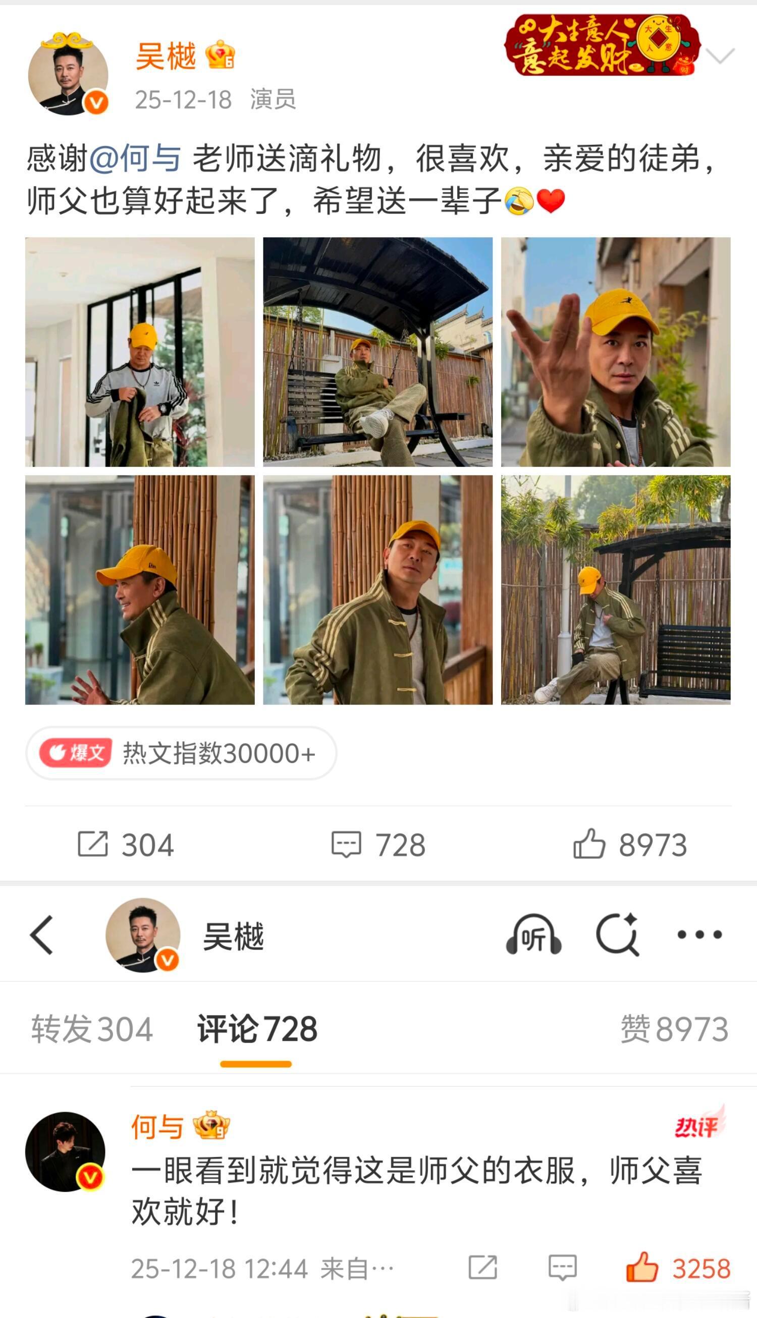何与官宣第一个代言阿迪后立马就送给了师父吴樾 好贴心啊