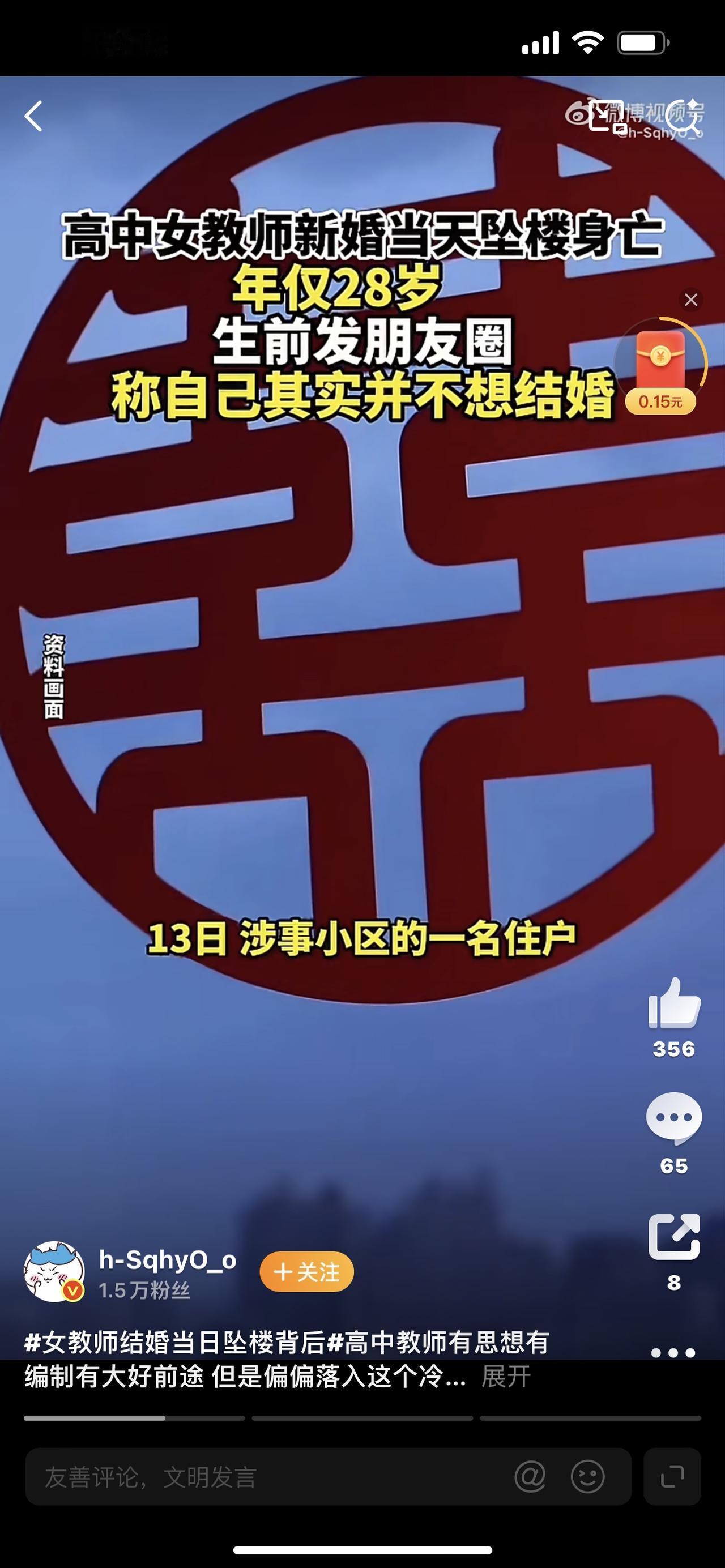 28岁女教师婚礼当天坠楼,新郎同学发声:她的最后10分钟,藏着多少无奈? 家人们,婚礼本该是人生最甜的高光时刻,可河南这位28岁的女教师,却把新婚之日变成了生命终点!穿着牛仔裤黑上衣,借口换婚纱独自关在婚房,从7楼纵身跃下,她的朋友圈遗言字字扎心,新郎同学的爆料更是让人心头一沉。 据知情人透露,逝者魏某是鲁山一高的历史老师,温柔负责,学生们都舍不得她。她和新郎经人介绍相恋一年多,拍了婚纱照,办了出阁宴,看似顺理成章的婚事,背后却早已暗流涌动。婚礼前一天,她突然发朋友圈说要取消婚礼,没过多久又悄悄删除;结婚前夜,她不愿回自己家,躲在同学家过夜,直到清晨被家人叫回,硬着头皮上了婚车。新郎的高中同学回忆,新郎本科毕业有正式工作,但上学时就有些"油嘴滑舌",属于班里的边缘人物,而魏某在遗言里直接吐槽对方"蹬鼻子上脸只会气人"。 本以为是彩礼纠纷或婆家刁难,可转折点来了!村干部走访后证实,两家经济条件相当,网传高价彩礼和逼婚的说法并不属实,事发后两家人只剩极度悲伤,根本没提彩礼退还的事。更让人揪心的细节被揭开:魏某从上大学起就被父母催婚,多次抗争甚至以死相逼,最终还是选择"听话"妥协;她坠楼后遗体被一楼业主阻拦,因为担心房子变"凶宅",直到第二天才得以移出;婚房里的喜字还没来得及撕,桌上的糖果散落着,喜庆的痕迹和悲剧的结局形成刺眼对比。 新郎同学的发声里,没有激烈的指责,只有惋惜:"没想到她心里压了这么多事,要是有人早发现她的绝望,哪怕劝一句'不想结就不结',也不会是这个结果。"是啊,28岁的她,有稳定的编制工作,有学生的爱戴,本该有无限可能,却在"必须结婚"的世俗期待里,走到了绝境。她的遗言里写着"想把骨灰撒在有风有太阳的地方",活着没能拥有的自由,成了临终前唯一的奢望。 这场悲剧不是个例,多少人被"到年龄就该结婚"的观念裹挟,多少"为你好"变成了无形的枷锁。婚姻该是心甘情愿的奔赴,而不是退无可退的选择。如果你的身边也有人正被催婚困扰,不妨转发这篇文案,告诉TA:你的幸福,从来不该被年龄和世俗定义。评论区说说,你怎么看待催婚?你身边有过类似的无奈吗?教师坠楼事件 鲁山坠楼新娘