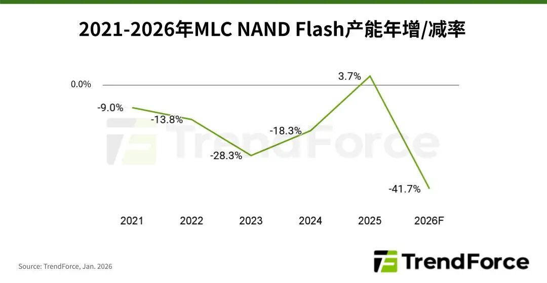 根据TrendForce集邦咨询最新研究,随着国际主要NANDFlash制造商退出或减少MLCNANDFlash生产,并集中资本支出与研发资源在先进制程,预估2026年全球MLCNANDFlash产能将年减41.7%,供需失衡情况加剧。