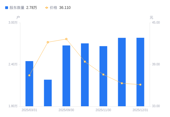 日期A股户数(户)流通A股户均持股数(股)户均持股市值(万元)2025-12-31278407377.0226.642025-12-20278307379.6826.792025-11-30266397683.5928.862025-10-31270287573.0029.852025-09-30267347656.2832.662025-06-30218169373.7639.562025-03-31244908350.2731.262024-12-31221189245.7733.932024-09-30216309421.8634.582024-06-30203959983.2831.02