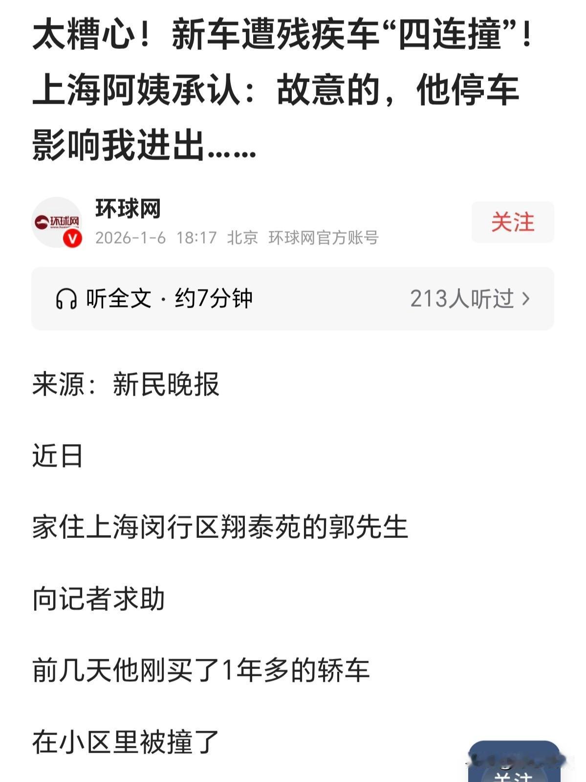 可怜之人,必有可恨之处!上海,一男子正在家休息,刚买一年多的新车,发来报警声,他赶紧冲下楼,眼前的一幕让他心都碎了,爱车右侧整个车身,被撞得狼狈不堪,调监控一查,竟然是同楼的一位残疾阿姨干的。她开着残障专用车,连续4次故意猛撞他的车,更过分的是,事后阿姨不仅没半点歉意,还仗着自己有残疾,态度嚣张得不行!经鉴定,车辆损失超过5000元。男子又心疼又气愤,明确表示:不原谅、不和解! 2025年12月30日,早上8点,郭先生刚起床,突然收到了车子的报警推送。 他赶紧跑下楼查看,当场就心疼得直跺脚,刚买一年多的新车,右侧已经被撞得不成样子。 整个右侧坑坑洼洼,漆皮剥落、凹陷连连,狼狈不堪,完全没了往日的光鲜模样。 这辆车才买一年,平时开车很在意,生怕刮了碰了,这下可好,直接给撞花了。 他赶紧找物业调监控,这不看不知道,一看气肺都气炸了。 撞车的不是别人,正是同楼的一位残疾阿姨。 监控里清晰显示,阿姨开着自己的残障专用车,对着他的车连续4次故意猛撞,每一下都带着十足的恶意。 更过分的是,郭先生找到阿姨理论时,她不仅没有半点歉意,反而仗着自己身有残疾,态度极其嚣张。 一口咬定郭先生的车,挡了她的路,撞了也是活该。 都说远亲不如近邻,这楼上楼下住着,低头不见抬头见,这到底是多大的仇,多大的怨? 原来,矛盾的根源,竟然就出在一个停车位上。 小区地面有公共停车位,郭先生刚搬来不久,对停车规则不太熟悉。 平时正常下班,回来停车还能有位置,如果加班回来晚就麻烦了,围着小区一圈圈转,一位难求。 有一次回家晚了,实在没车位,他就会把车停在楼下通道的一个公共车位上。 可这个车位,早就被这位残疾阿姨当成了自己的专属地盘。 阿姨口口声声说,这个车位是物业专门划给她的,就算她的车不停在这,别人也不能停。 但物业和保安都站出来证实,郭先生停车的位置是6米宽的公共通道。 而阿姨的残障车只有1米宽,就算郭先生的车停在这,也完全不妨碍她的车正常进出! 更让人无语的是,这个所谓的“专属车位”,根本是阿姨私自霸占的。 物业早就为小区残疾人安排了专门的车棚和无障碍停车位。 其他残疾业主都规规矩矩停在那里,只有这位阿姨,以“不方便”为由,在物业没同意的情况下,把车挪到了公共车位上。 为了不让别人停车,她还私设路桩,甚至把小区的无障碍停车位牌子,偷偷搬到了自己占的车位旁。 之前,郭先生就因为回来太晚,实在找不到地方,停在这个车位。 按理说,就算你的车位,只要能正常出行,都是邻居,也应互相体谅一下。 可阿姨却不管你是谁,我的地盘我做主,发现后,大清早叫保安来喊他挪车,双方为此发生过好几次争执。 事发当天,郭先生回家实在没车位,只好再次停到这个位置,只是车头往前多伸了50厘米,就遭此横 祸。 经鉴定,郭先生的车损超过5000元。他又心疼又气愤,明确表示不原谅、不和解,直接报了警! 这一下,阿姨认识到问题的严重性,彻底慌了神。 她赶紧找到居委会和社区,主动承认错误,请求和解。 还乖乖把残障车停到了物业指定的专用车位,拆除了私设的路桩,撤走了私自摆放的牌子。 可就算阿姨态度一百八十度大转弯,郭先生也铁了心不接受调解。 社区出面沟通,希望双方和平解决,郭先生依旧没有松口! 这件事曝光后,很多人纷纷表示支持郭先生。 有人直言:残疾不是特权,更不是为非作歹的保护伞。 法律面前人人平等,不管身体是否有缺陷,只要触犯了法律,就必须承担相应的责任。 这位阿姨的所作所为,不仅不尊重他人,更是对法律的漠视。 身有残疾值得同情,但心术不正,终究难逃众人的谴责和法律的制裁! 《刑法》第275条:故意毁坏公私财物,数额较大或者有其他严重情节的,处三年以下有期徒刑、拘役或者罚金;数额巨大或者有其他特别严重情节的,处三年以上七年以下有期徒刑。 阿姨因车位纠纷,连续4次故意猛撞,郭先生车辆,车损超5000元,已达刑事立案标准,涉嫌故意毁坏财物罪 。 肢体残疾不属于法定不负刑事责任或从轻减轻的情形,不能成为违法挡箭牌。 《治安管理处罚法》第49条:盗窃、诈骗、哄抢、抢夺、敲诈勒索或者故意损毁公私财物的,处五日以上十日以下拘留,可以并处五百元以下罚款;情节较重的,处十日以上十五日以下拘留,可以并处一千元以下罚款。 若阿姨的行为未达刑事立案标准,仍构成行政违法,应受治安处罚。 阿姨事后虽主动整改、请求和解,但不影响对其违法行为的定性与追责。 法律面前人人平等,残疾身份不能成为逃避行政处罚的借口。 对于残疾阿姨的过分行为,你怎么看呢? @静心法谈 学法辨是非,慬法不吃亏。