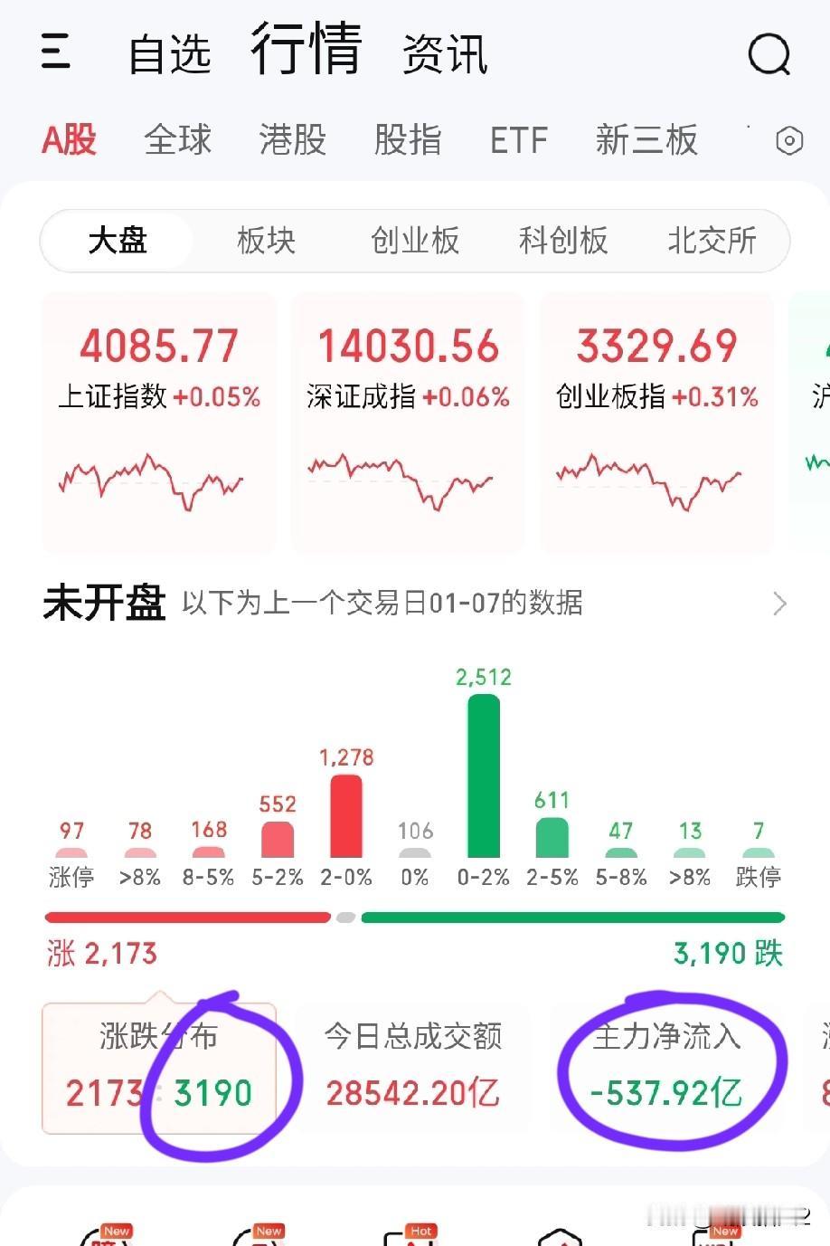 1月8日早评。隔夜美股三大指数涨跌不一,均呈冲高回落之势(图1、2),呈现短期顶部形态。贵金属及其他资源类产品均出现明显调整(图3)。 A股14连涨,基本上创造了历史之最。但创出10年新高的同时,市场短期已出现大面积获利了结的情绪。昨天两市3000多家个股下跌,主力资金净流出500多亿(图4),短期热点商业航天、AI应用、脑机接口、贵金属和工业金属等均出现了明显阶段高点特征:冲高回落或放量滞涨。 那么,如何看待接下来的行情呢? 毋庸置疑,很多人部分踏空或完全踏空了本轮行情,出乎意料的强势。这让我们深刻领会到,市场的涨跌完全看政策而不是技术面。今天央行又启动了11000亿逆回购,从理论上讲,资金流动量非常充裕。只要市场成交量不减少,市场即使有短调也会很快结束,前期踏空的资金正在眼巴巴等着正场机会。预计,指市下半周会出现一个15~30分钟回调,指数可能回踩一下4030±20点区间,回调就是进场机会。 个人观点,不构成投资依据,不喜勿喷。祝大家今日好运。