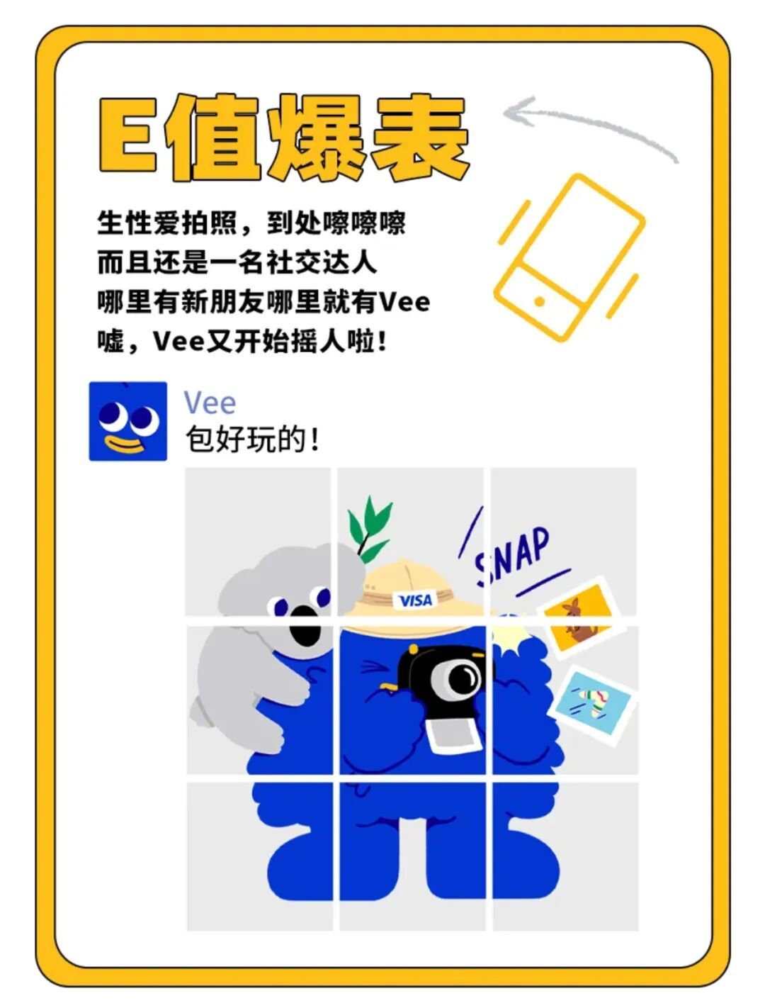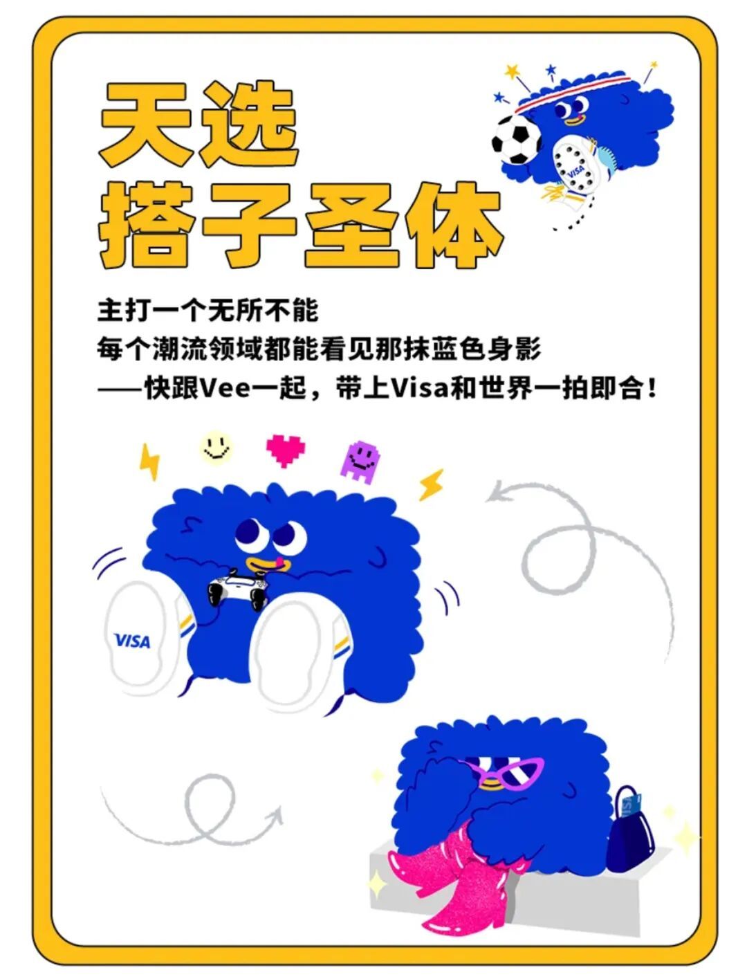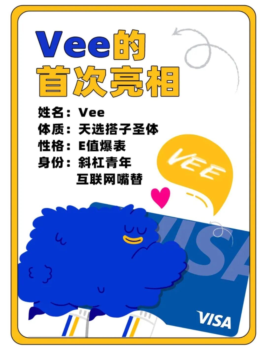 首次亮相的Vee介绍自己是斜杠青年、互联网嘴替,还是天选搭子圣体,每一个标签都在说“我要和年轻人做朋友!”,图源:公众号Visa官方服务号