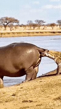 这得多倒霉啊!这天在非洲大草原上,一只饥饿都鬣狗发现了一只大河马正蹲在河边休息,而它正好暴露了它的臀部,众所周知鬣狗号称肛肠科主任,大河马肥美的臀部瞬间吸引了它。 于是一个加速跑到了河马的后翘附近,刚想一口咬下去,谁知大河马直接来了个发愤图强,喷的鬣狗满嘴全身都是,鬣狗痛苦万分,直接弹射后退到老远,看它那动作表情就知道伤的有多深,有多痛苦。估计它的余生都会对河马产生阴影了。