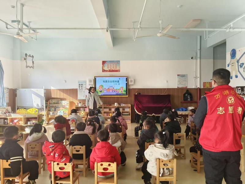 1月7日上午,蒙城县庄周街道万湖社区新时代文明实践站联合第六幼儿园开展了地震应急安全演练活动。