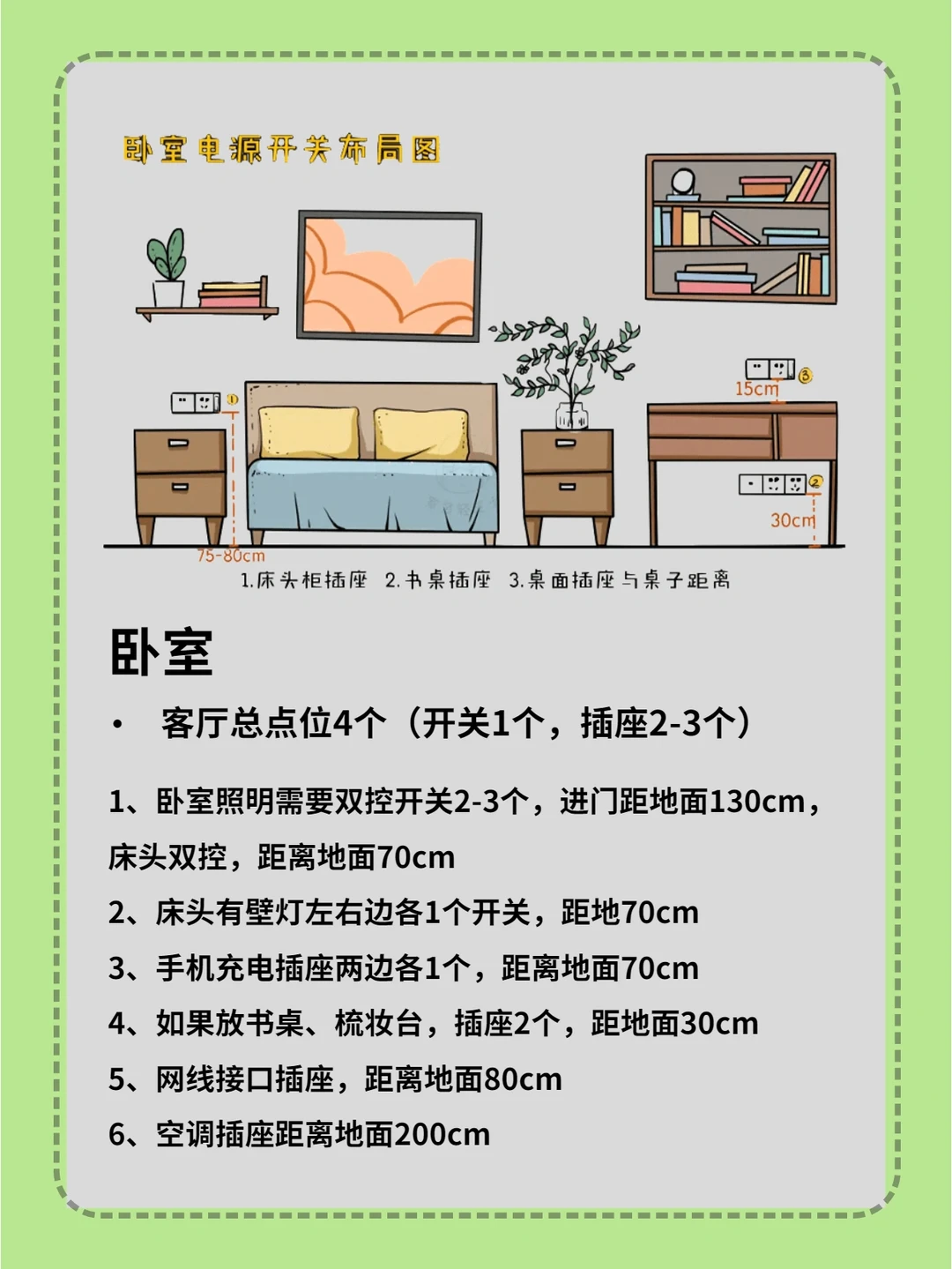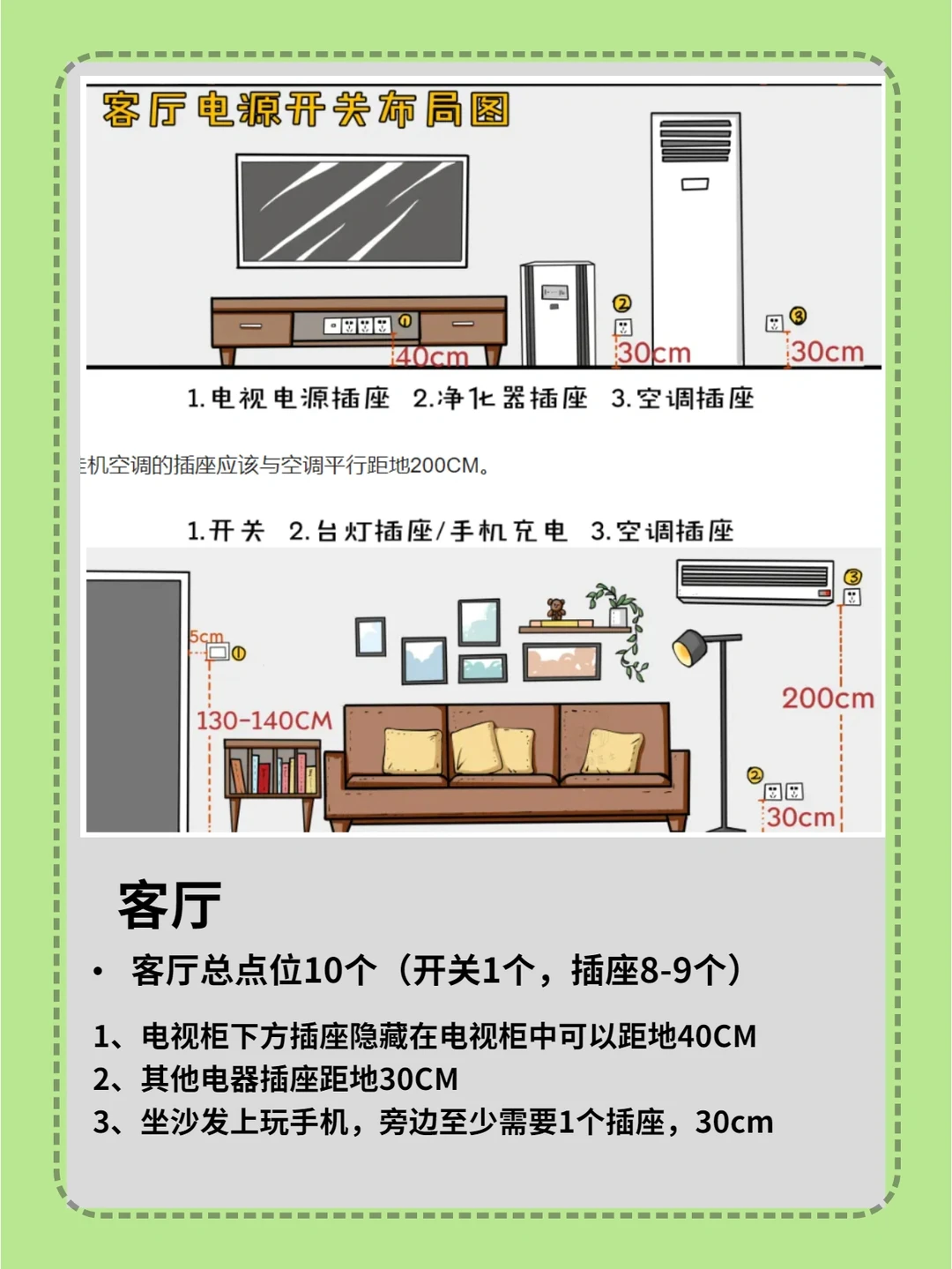因第一次在装修的时候 不知道在哪里装,装多高 后期入住发现插座不够用,而头疼 我这边整理了一些开关插座布局图 注意以下几点: 1⃣一般插座距离地面30cm 2⃣一般开关距离地面130cm 3⃣一般挂机空调距离地面200cm 4⃣电视柜一定多留几个插座跟网线插座 5⃣厨房操作台上方多留几个插座,距离台面30cm 6⃣厨房操作台下方应留几个插座供小家电使用,距离30cm