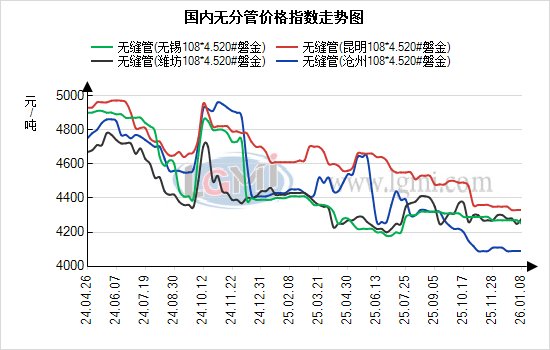 1月8日国内无缝管市场价格小幅上行。临沂钢投管坯价格今日价格稳,当前20#热轧管坯市场报价为3350元/吨。据兰格云商平台监测数据显示,国内重点城市108*4.5规格无缝管均价为4300元/吨,与上个交易日基本上调15元;从区域报价来看,重点市场沧州报4010元/吨、上海报4190元/吨、无锡报4200元/吨。值得关注的是,近期南北区域价差呈现小幅波动,沧州与江阴价差为60元/吨,江阴价格偏高;上海与山东价差约70元/吨,上海价格处于高位。