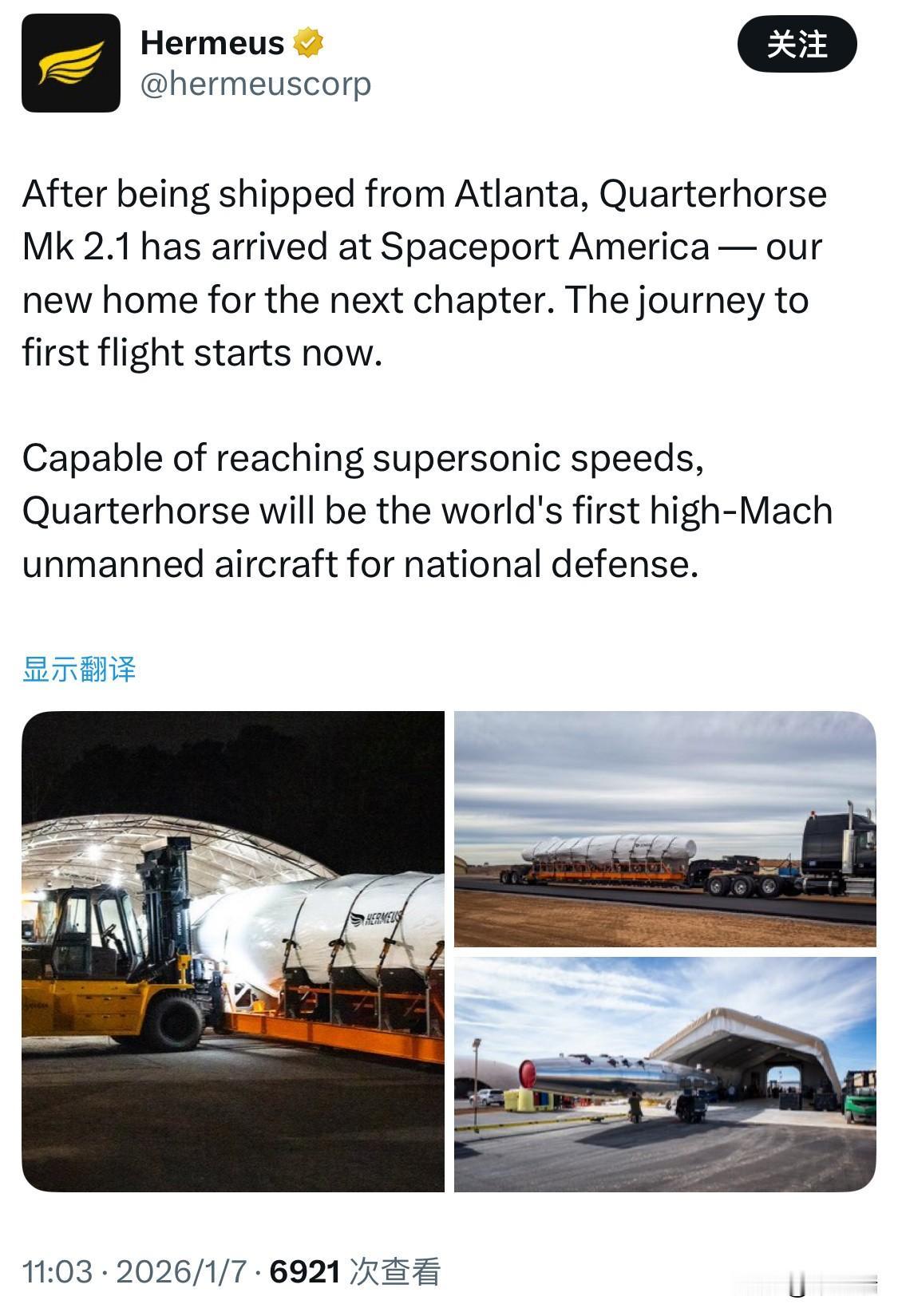 Hermeus 公司的 Quarterhorse Mk 2.1 无人机已抵达美国太空港(Spaceport America),准备进行首飞测试,目标是成为世界上第一架用于国防的高马赫无人机。 Quarterhorse Mk 2.1 详情 目的地: Hermeus 团队已部署至位于新墨西哥州的美国太空港,建立了机库和飞行测试运营基地。 能力: 该机型旨在达到超音速,是实现高超音速(5马赫或更高)飞行的关键一步。 开发历程: Hermeus 采用迭代开发方法,每年制造并测试一架原型机。之前的 Mk 1 亚音速原型机已于 2025 年 5 月完成首飞。 设计: Mk 2.1 尺寸与 F-16 战斗机相当,采用三角翼设计、变截面进气口,并由普惠 F100 发动机提供动力。 下一步: 团队将进行机身(尾翼和机翼)重组、地面操作和系统检查、发动机地面运行,以及为首飞做准备。