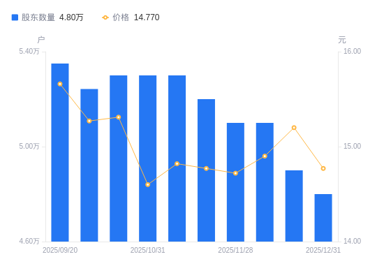 日期A股户数(户)流通A股户均持股数(股)户均持股市值(万元)2025-12-314800012166.6717.972025-12-194900011918.3718.122025-12-105100011450.9817.062025-11-285100011450.9816.862025-11-205200011230.7716.592025-11-105300011018.8716.332025-10-315300011018.8716.092025-10-205300011018.8716.872025-09-305243011138.6617.012025-09-205350010915.8917.09