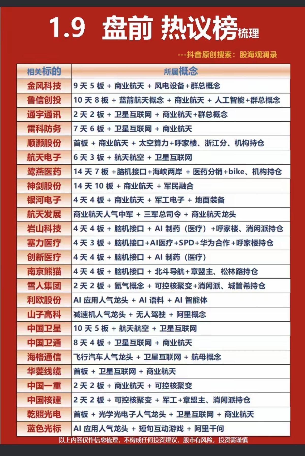 1.09周五 成交活跃个股 热议榜! 1.商业航天+风电+群总 2.卫星互