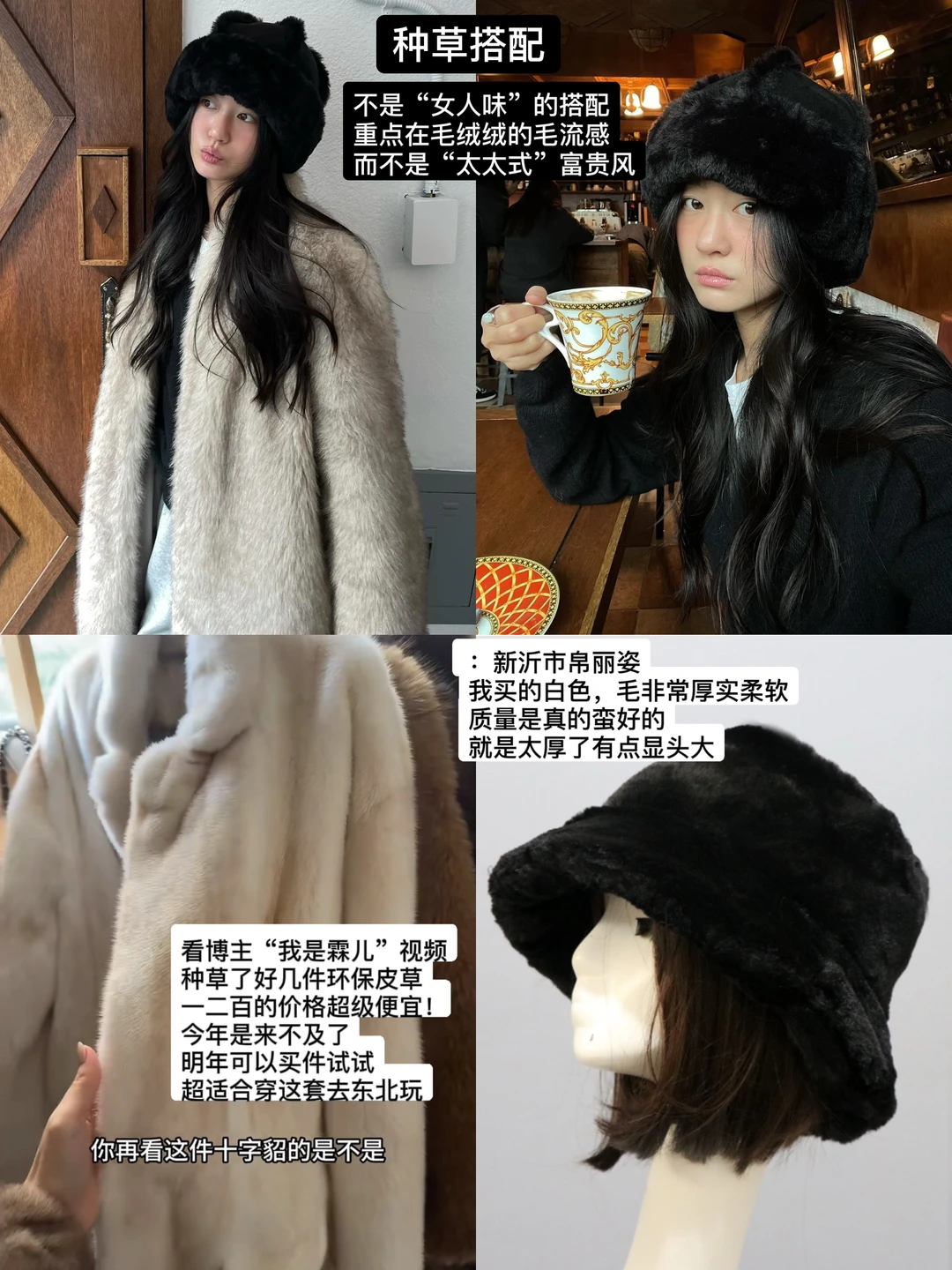 ▪️仿皮草大衣外套➕黑色毛绒帽子