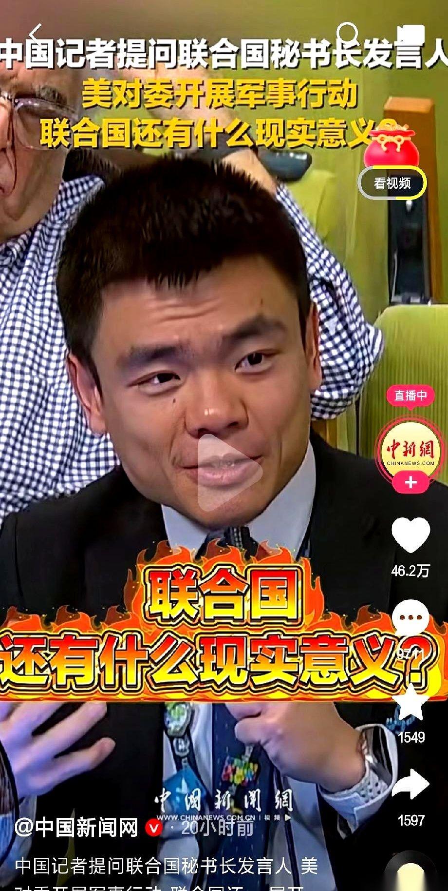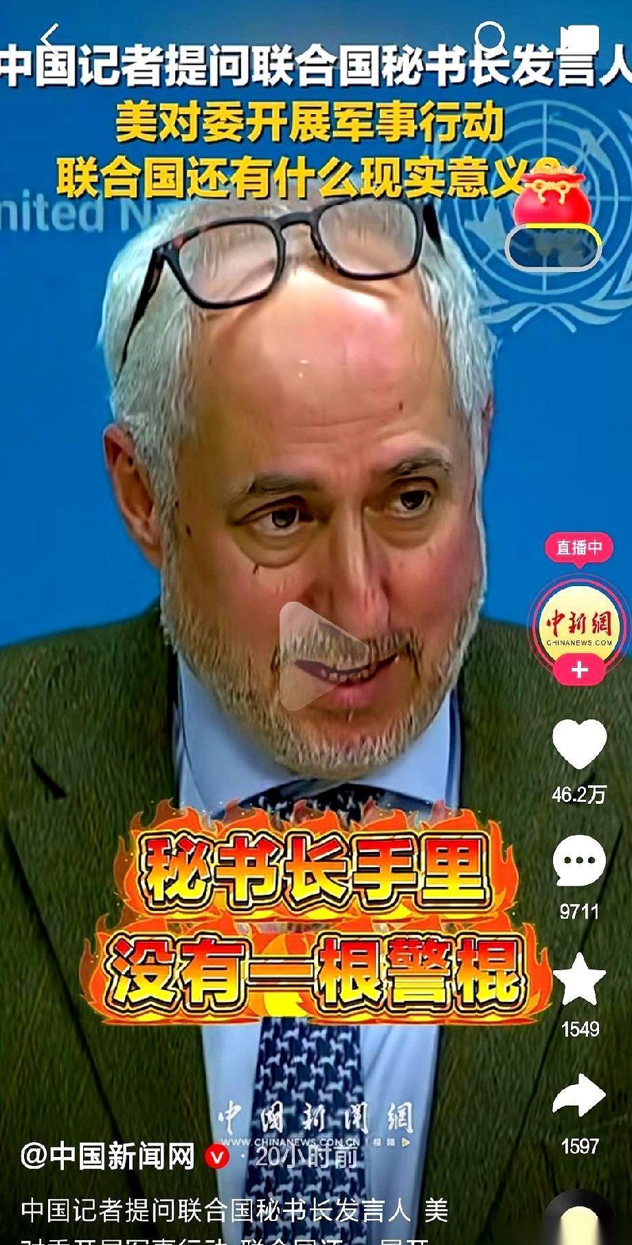 联合国记者会现场,一个中国记者拿到了话筒。 全场的镜头都对准了他。他没问数据,也没谈援助,而是把一个问题,像块石头一样,直直地砸向了发言人的脸:美国满世界抓别国总统,联合国还有存在的必要吗? 空气瞬间凝固了。旁边昏昏欲睡的同行,笔尖停在半空,猛地抬头。所有摄像机,像听到指令一样,唰地一下,全都从记者脸上摇到了发言人脸上。 发言人脸上的职业微笑,僵住了。他下意识地扶了一下眼镜,一个没有任何意义的动作。 他张了张嘴,似乎想给出一个强硬的回应,但最终,只是漏出了一丝苦笑。 他拿起水杯,喝了一口,然后对着话筒,用一种近乎疲惫的语调说,各国都应该遵守规则,可是……联合国秘书长,他手上也没有一根电棍,能去敲那些成员国的脑袋,不是吗? 话音落下,整个大厅鸦雀无声。 那一刻,全世界都听懂了这句话的潜台词。规则写在纸上,但棍子,在别人手上。
