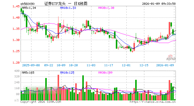 1月9日,证券ETF龙头(560090)开盘涨0.00%,报1.323元。证券ETF龙头(560090)重仓股方面,东方财富开盘涨0.00%,中信证券涨0.00%,国泰海通涨0.00%,华泰证券跌0.21%,广发证券跌0.13%,招商证券涨0.00%,东方证券跌0.37%,申万宏源涨0.19%,兴业证券跌0.14%,中金公司跌0.28%。