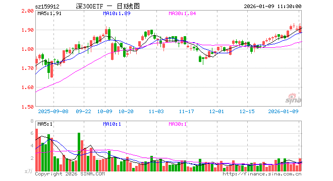 1月9日,截止午间收盘,深300ETF汇添富(159912)涨0.68%,报1.916元,成交额376.98万元。深300ETF汇添富(159912)重仓股方面,宁德时代截止午盘涨0.05%,美的集团涨0.67%,中际旭创跌1.66%,东方财富涨0.29%,新易盛跌2.23%,立讯精密涨1.07%,比亚迪涨0.35%,阳光电源跌0.70%,五粮液涨0.22%,胜宏科技跌2.23%。