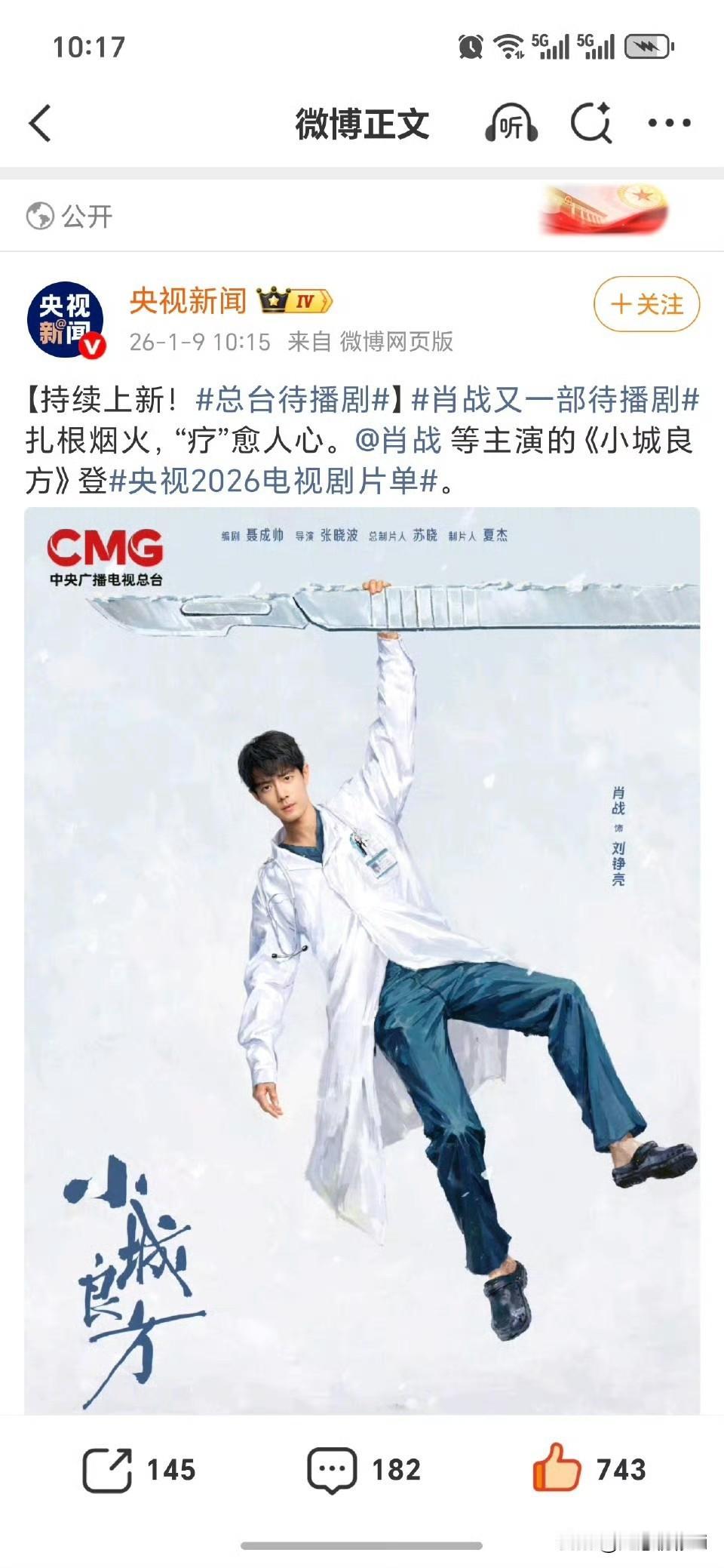 肖战的《谍报上不封顶》和《小城良方》登央视待播剧片单,一部谍战,一部现实主义医疗剧,完全不一样的类型和角色,期待肖战的演绎肖战 肖战谍报上不封顶