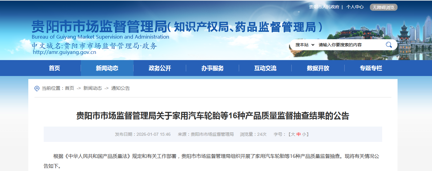 贵阳市市场监督管理局关于家用汽车轮胎等16种产品质量监督抽查结果的公告