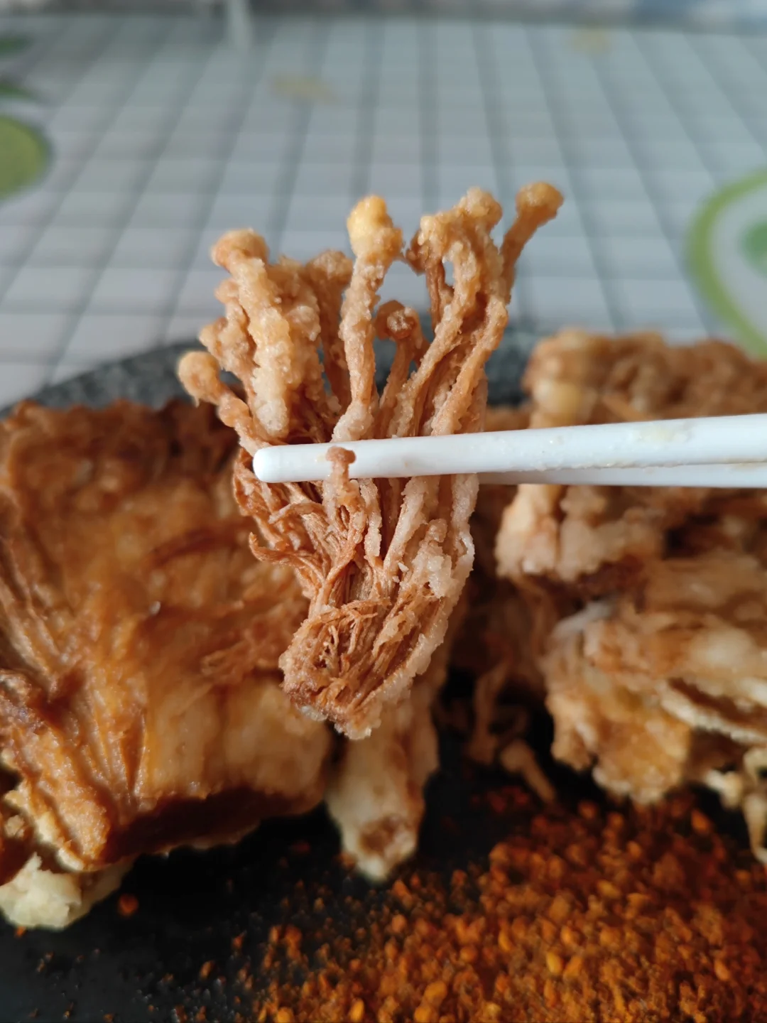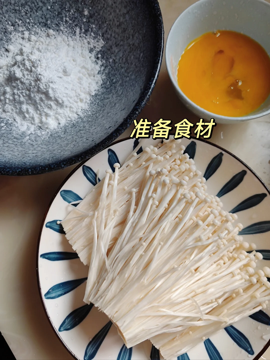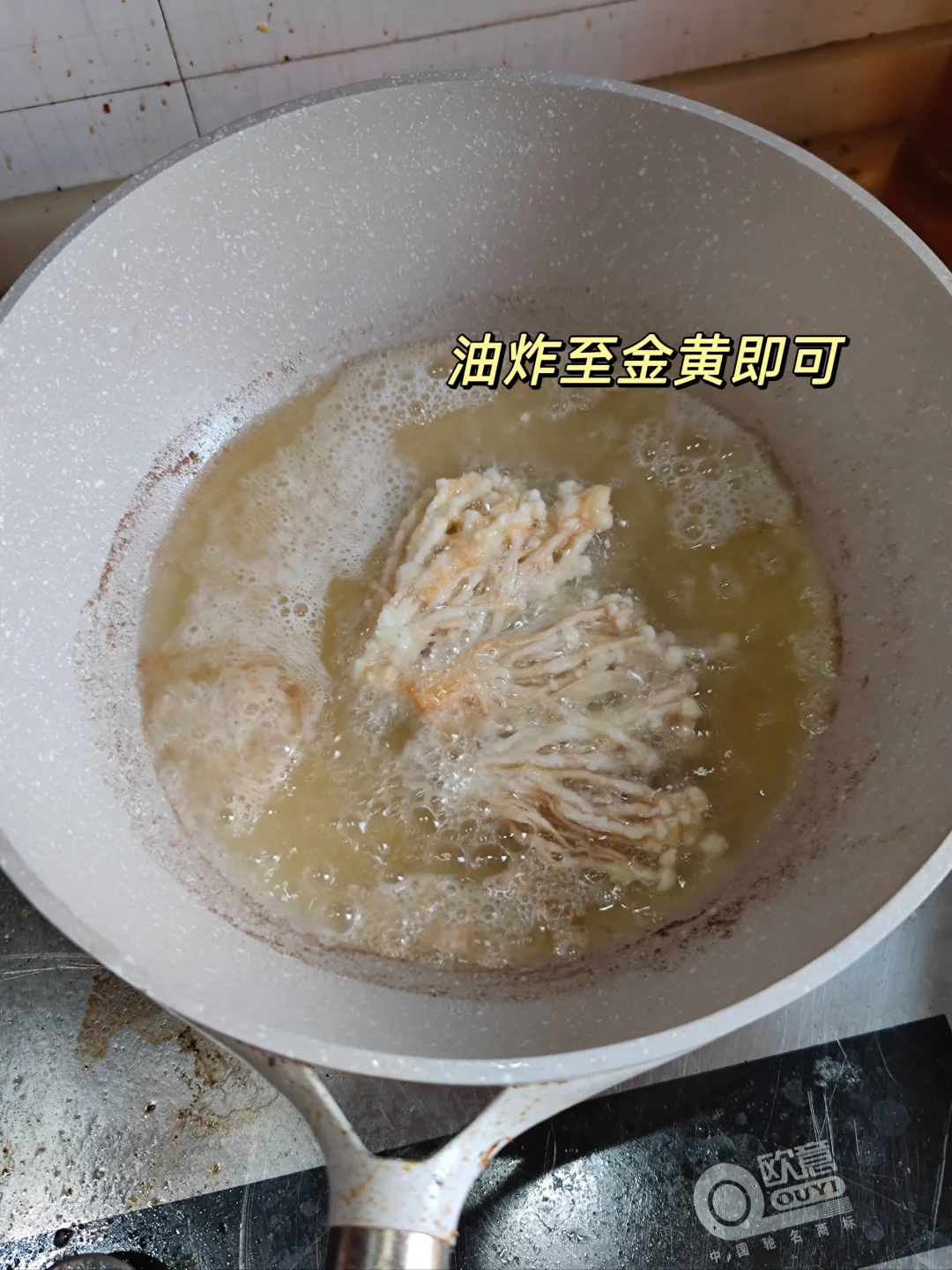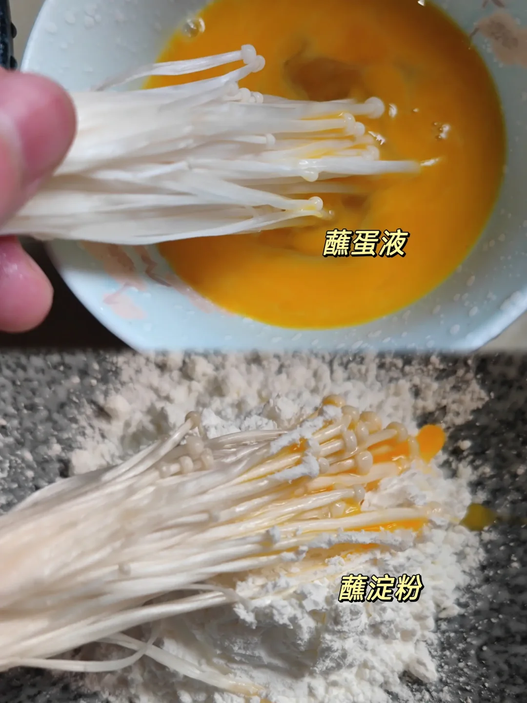 方便又好吃的小食,油炸金针菇 做法⬇️ 1⃣️准备食材:金针菇洗净,吸干水分。准备鸡蛋液·淀粉 2⃣️金针菇散开蘸鸡蛋液,蘸淀粉。 (散开点会比较好,沾在一起内层的可能会没炸熟) 3⃣️热油下锅,炸制两边金黄即🉑 (冷油下锅,金针菇吃起来可能会软趴趴) 4⃣️撒椒盐或者辣椒粉