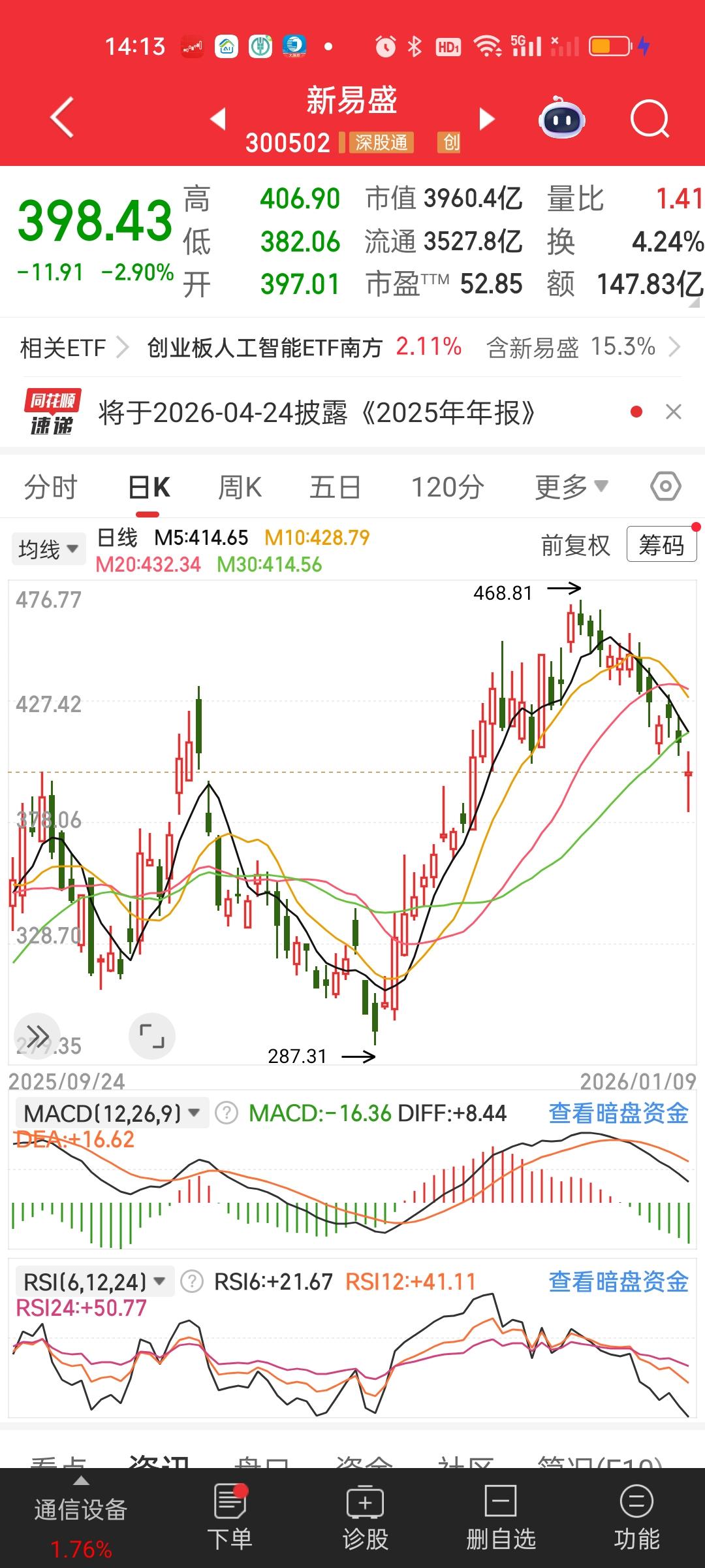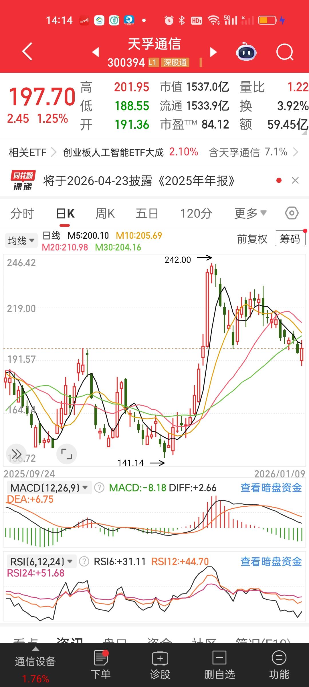 CPO不要急着加仓啊,里面的核心大票都是妥妥的下行趋势啊,你最起码要等它的核心抱团股企稳了再加才好吧。那样你才不会太被动啊!到了加仓的位置,你加进去,涨了以后进可攻退了守,你现在每天都加,每天都加,用不了几天你就加成重仓了,到时候只会动弹不得的。 见底之前大概率会有一次加速赶底,也就是跌幅会在6%或者7%以上的。你确定你受得了吗?而且历年来没有哪个板块会连续两年都爆炒的,CPO在2025年已经爆炒过了,在2026年继续暴涨的可能性也不大!