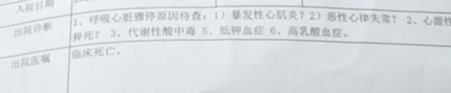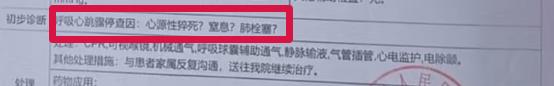 医院的急救病历,初步诊断呼吸心跳骤停,查因不定。图/受访者提供。