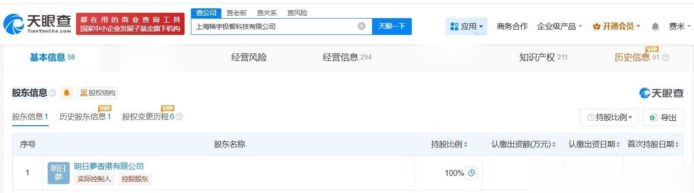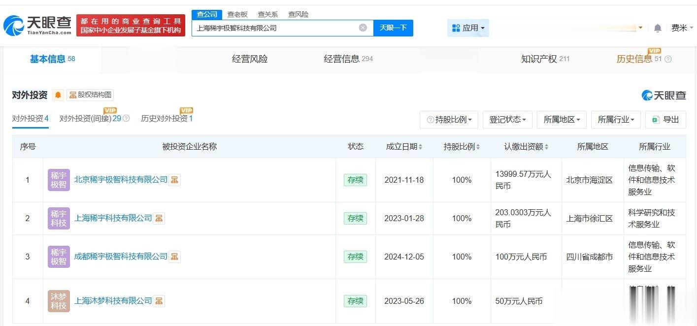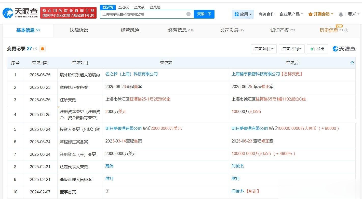 天眼查工商信息显示,MiniMax关联公司上海稀宇极智科技有限公司成立于2021年11月,经营范围包括人工智能基础软件开发、人工智能应用软件开发、计算机软硬件及辅助设备批发等。股东信息显示,该公司由明日夢香港有限公司全资持股。变更记录显示,去年6月,该公司发生工商变更,注册资本由2000万美元增至10亿人民币,去年2月,魏伟卸任该公司法定代表人,由闫俊杰接任。对外投资信息显示,该公司对外投资4家企业,分别是北京稀宇极智科技有限公司、上海稀宇科技有限公司、成都稀宇极智科技有限公司、上海沐梦科技有限公司。