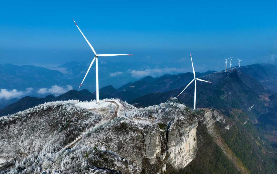 1月6日,雾凇将重庆市黔江区五福岭风电场装扮一新。