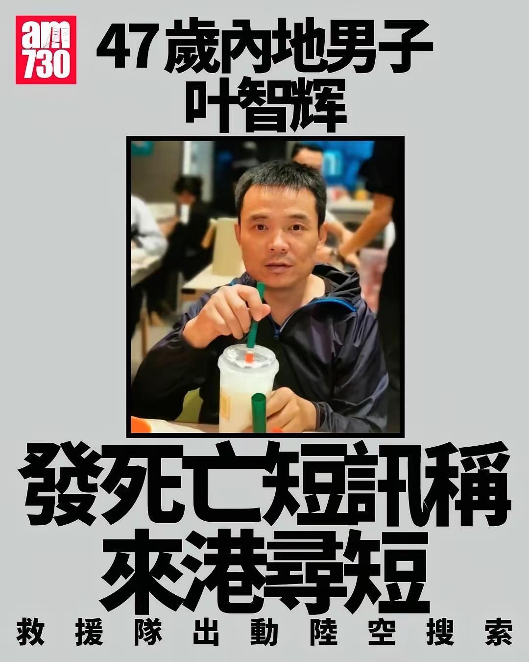 深圳47岁男子叶智辉中年失业又欠很多外债,对自己的前途倍感失望,1月4号从深圳出发到香港,1月5号在香港给姐姐发短信告诉她要在香港自杀,姐姐连忙给香港警察打电话报警并赶到香港,香港警察定位叶智辉在清水湾野郊公园附近,但是搜索3天也没有找到他的踪影,目前还在查找,人到中年不容易啊,失业还有外债,但是还是要想开点,慢慢找工作来还债,生活会好的。
