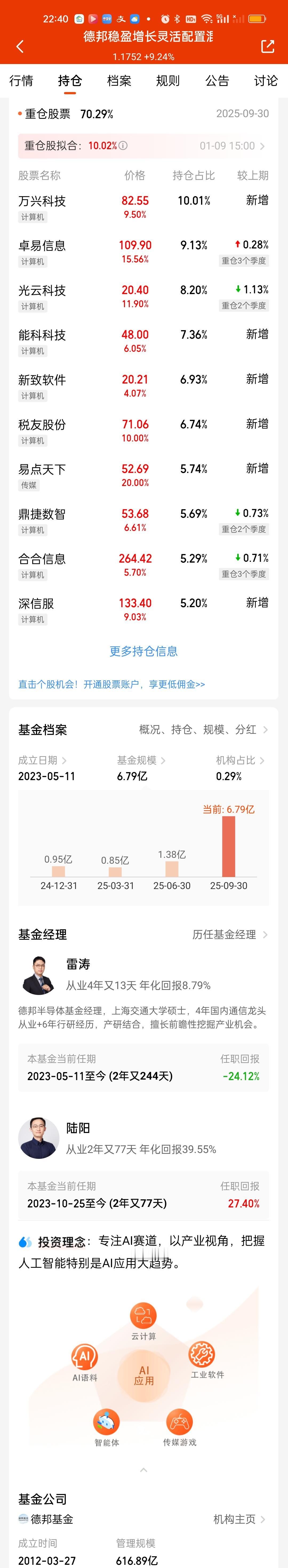 德邦稳盈增长难怪涨这么好的,核心重仓股有20%涨停的,有10%涨停的,前三大重仓股最低都涨了9.50%以上。分别上涨了9.50%,15.56%,11.90%。还有涨9.03%的。 我们专业做基金博主的,就一定要善于发现优秀的基金。要善于发掘有潜力的板块。并且能快速找到这个有潜力板块的基金,相比较许多人还看好CPO,创新药,机器人这些25年大炒特炒过的板块。我是坚定的认为只有商航,AI信用这样的新板块才能有更大的增长空间!