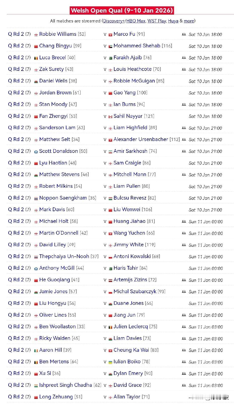 威尔士公开赛资格赛第一轮结束,7名中国球员晋级。刚刚,白雨露3-4负于塔希尔。今天第二轮,常冰玉等14名中国球员出战。 白雨露凌晨与塔希尔战成3-3,因为时间关系暂停,比赛重启后,白雨露决胜局一度60-49领先,可惜最后防守多次失误,最终断送好局。一句话,还是实力原因。 其他中国球员的战绩如下: 傅家俊4-3逆转许医尘 黄佳浩4-2胜蕙兰 高阳4-2胜平海 王雨晨4-2胜旺哈鲁泰 江俊4-2胜努斯勒 张家玮4-3绝杀巴拉诺夫斯基 刘文炜4-3绝杀巩晨智 吴安仪0-4负海菲尔德 赵瀚洋1-4负克雷吉 蓝裕豪2-4负谢哈布。 另外资格赛第一轮,埃文斯退赛,其对手正好是马克·艾伦的继子罗比·麦奎根,猜测埃文斯退赛跟这层关系有关。 今天威尔士公开赛资格赛将进行第二轮角逐,14名中国球员出战,争夺正赛名额,具体时间和对阵如下: 18点: 傅家俊vs罗比·威廉姆斯 常冰玉vs谢哈布 高阳vs乔丹·布朗 范争一vs纳亚尔 21点: 吕昊天vs克雷吉 刘文炜vs马克·戴维斯 明天凌晨0点: 黄佳浩vs霍尔特 王雨晨vs奥唐纳 贺国强vs齐津斯 刘宏宇vs杜安·琼斯 明天凌晨3点: 江俊vs奥利弗·莱恩斯 张家玮vs亚伦·希尔 徐思vs埃默里 龙泽煌vs阿伦·泰勒。 中国球员,加油!