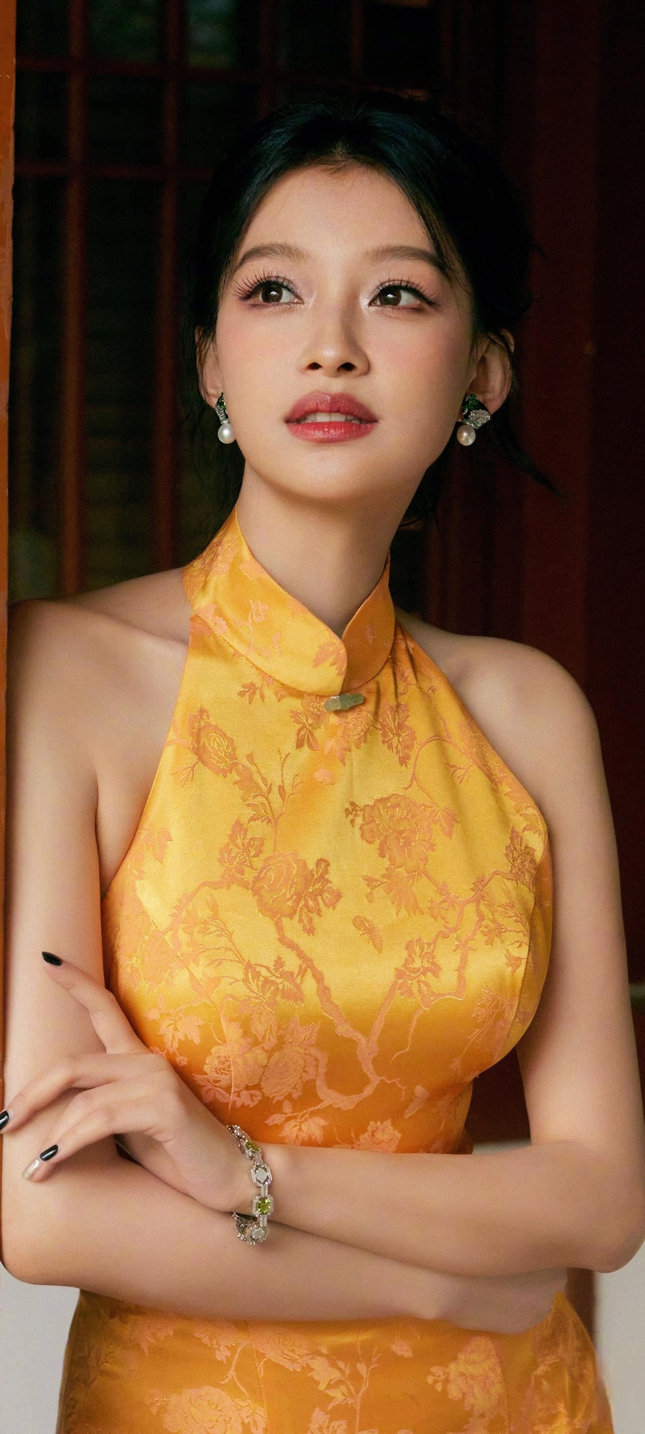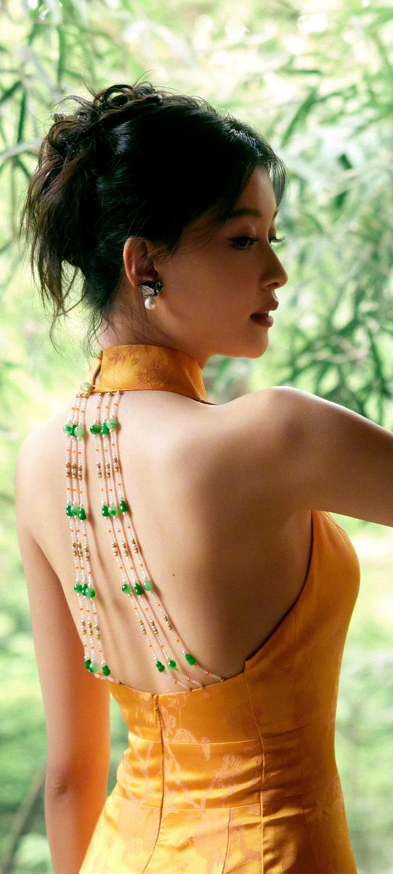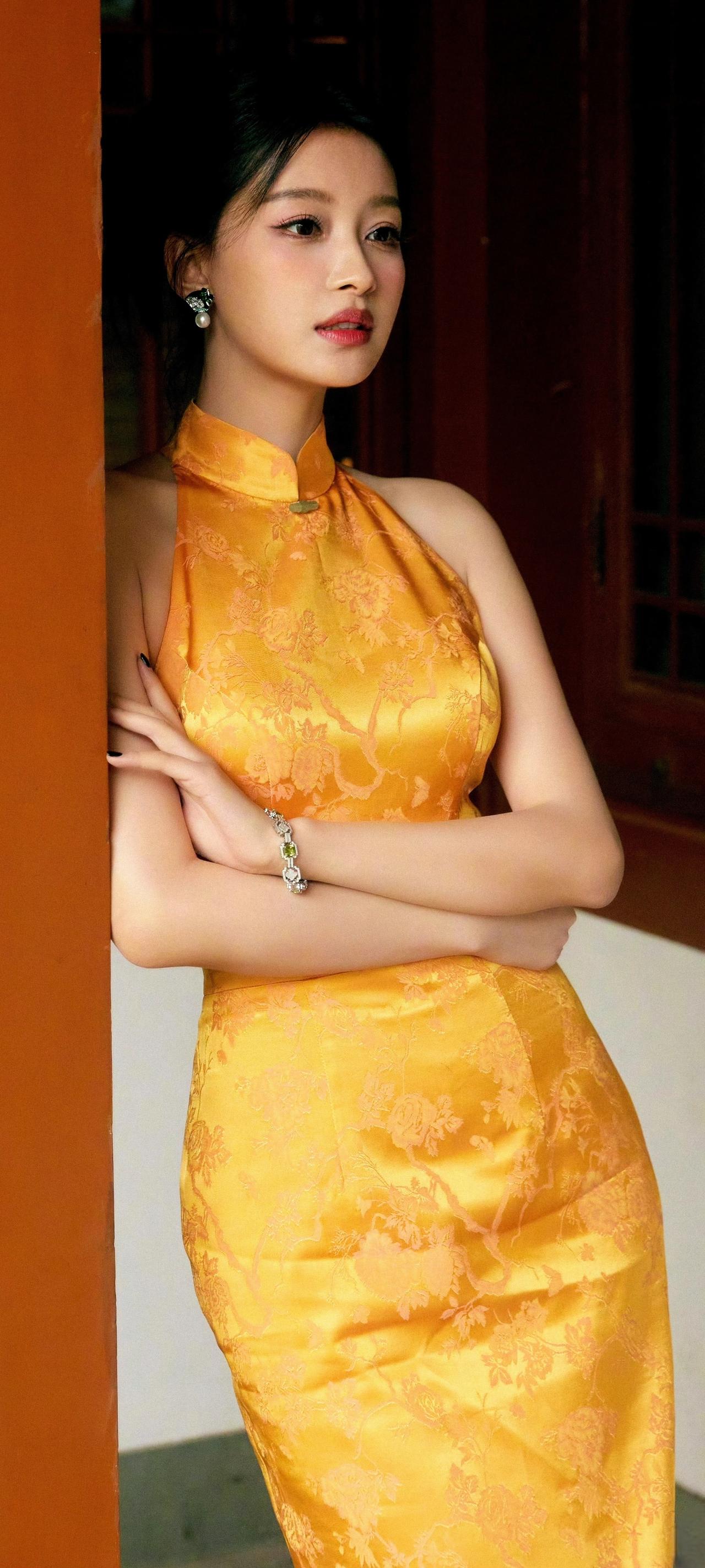 谁能拒绝孙怡的黄色旗袍造型啊! 立领勾勒天鹅颈,后背的珠链设计堪称点睛之笔,明艳