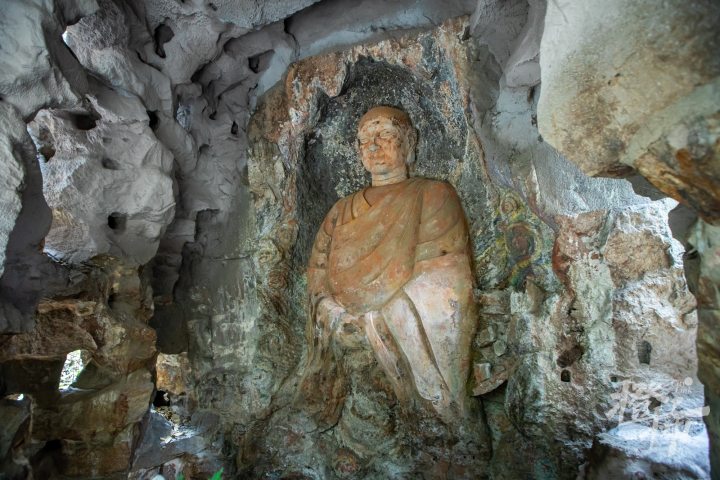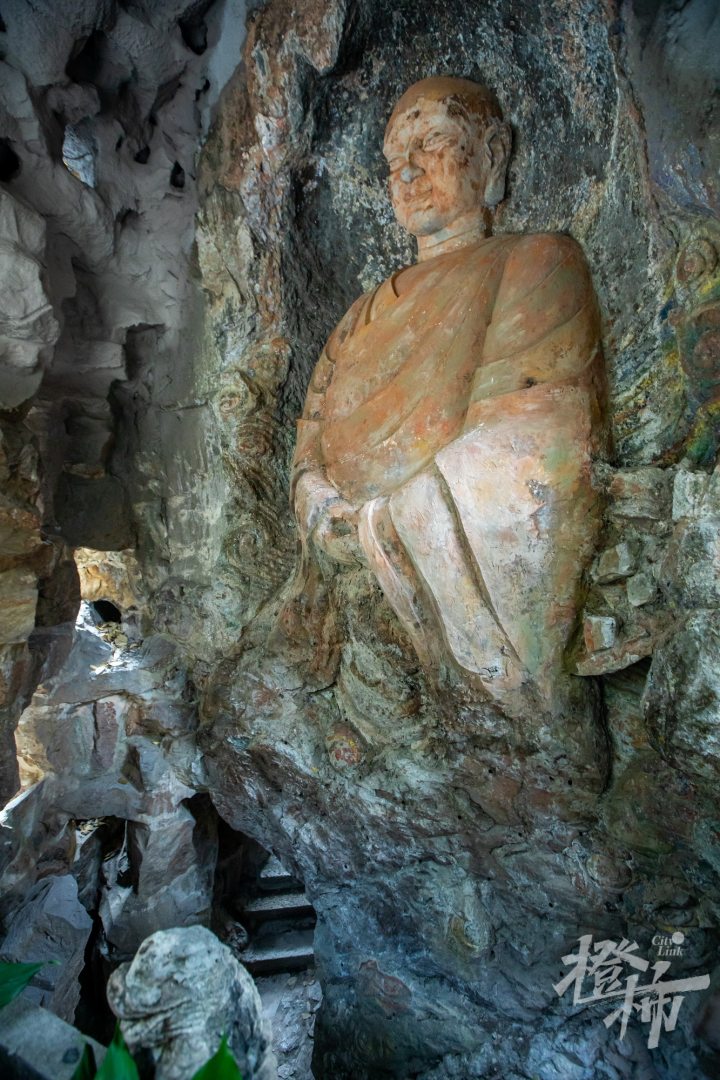 这里所提到的佛像,就是在半山腰无门洞里的慧开塑像。据考证,这尊塑像高约3.6米,雕造年代有多种说法,明代文献认为它是慧开为自己雕造的半身肖像,也有说法是元代或者明代时后人雕造纪念的。原始的石雕慧开像已毁,目前看到的是现代人补做的泥塑像。