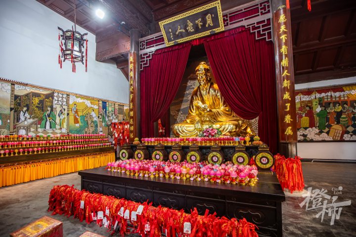 园内还有一座月老祠,坐东朝西,面阔三间,硬山顶,前檐柱是石柱,左右植古柏,室内祭祀月老,月老手执婚书,默默祝愿天下有情人终成眷属。塑像两边是彩色壁画,一边描述明代才子唐伯虎三笑姻缘故事,另一边描述唐代状元郭远振牵红线选宰相之女为妻的故事。心怀期许的游客,可在月老祠中虔诚许愿,祈求天赐良缘。