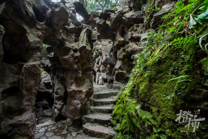月老祠背后,黄大仙洞旁,一直往上,就是随着山势搭建起来的假山群,全部用黄沙石叠成,错落有致、巍峨嶙峋。造园贴近自然、不着痕迹,将真山、假山、天然洞、人造洞融为一体,山后还有密林。