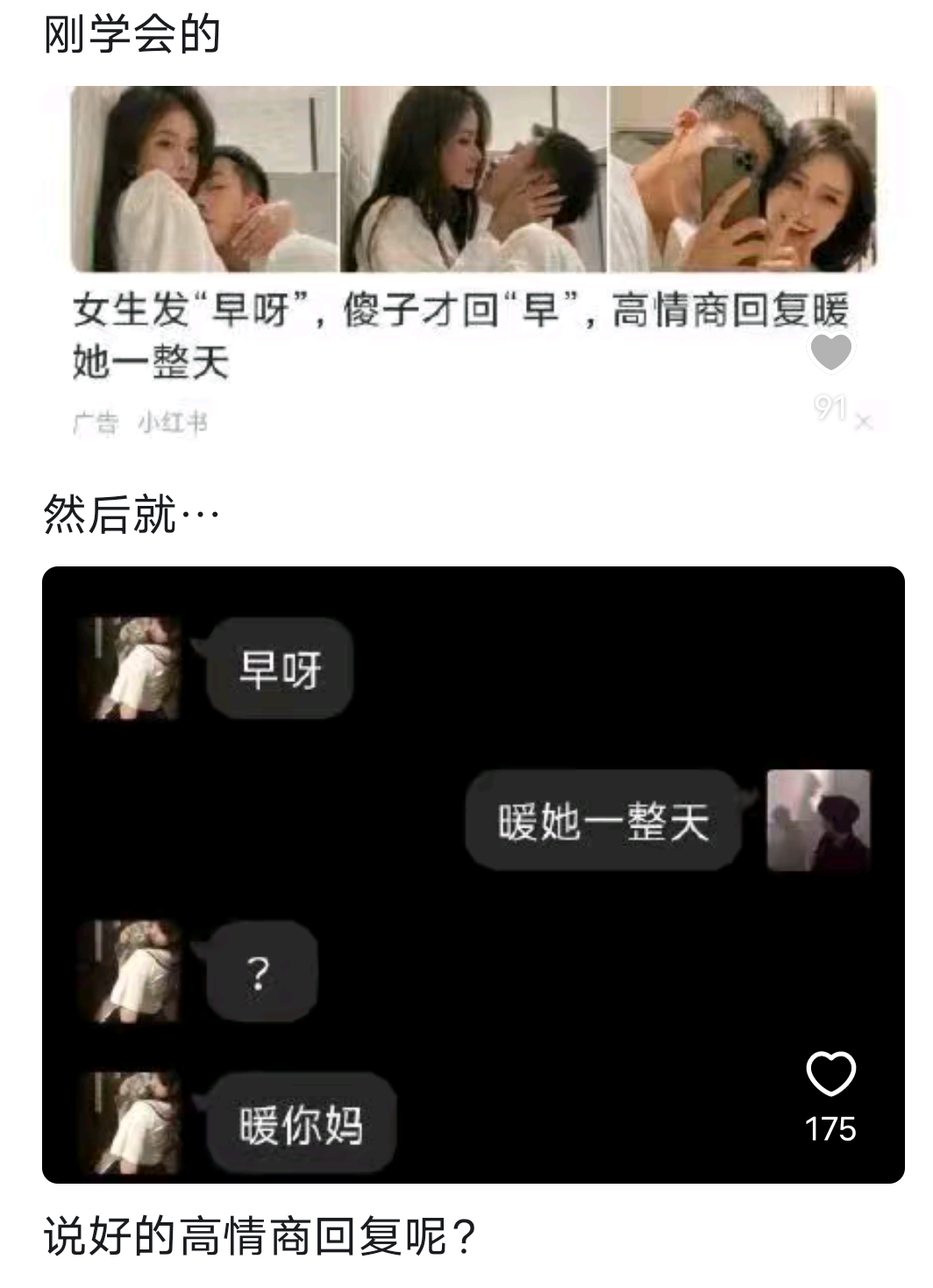 赶紧翻出你手机里最有趣的那一段,晒出来让大家羡慕嫉妒恨,让我看看谁的恋爱日常最戳笑点,评论区等你们开秀,速来!情侣搞笑回复 情侣搞笑回复 男女生聊天技巧 情侣聊天小技巧