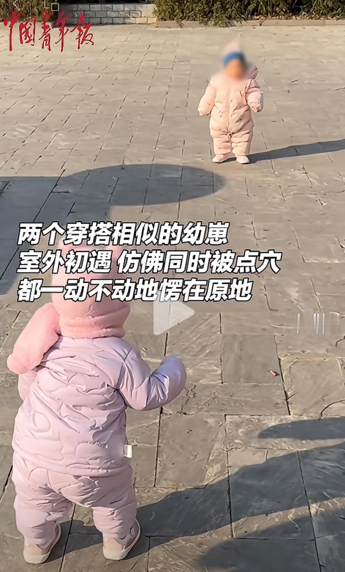近日,山东滨州,两个穿搭相似的幼崽,在散步的时候相遇。两个小家伙,在看到彼此之后,都停顿了下来。仿佛同一时间被点穴了一样。 两位可爱的小家伙,一动不动的站了一两分钟。好像两个武林人士,突然感觉到了对方高深莫测的实力。然后,谁也不敢轻举妄动,都在安静的打量着对方。似乎就在等待对方先出手,然后看出对方的破绽,再行动。 当然回到现实中,应该是这样的:这两个小家伙,肯定都很好奇,心里都在想,对面那个跟我差不多的小朋友,他是谁呀。 由于双方都很好奇,因为两个人模样穿搭相似,年纪相似,身形相似。所以,两个小家伙都停顿了下来,在相互对视着。就是这么的有趣!