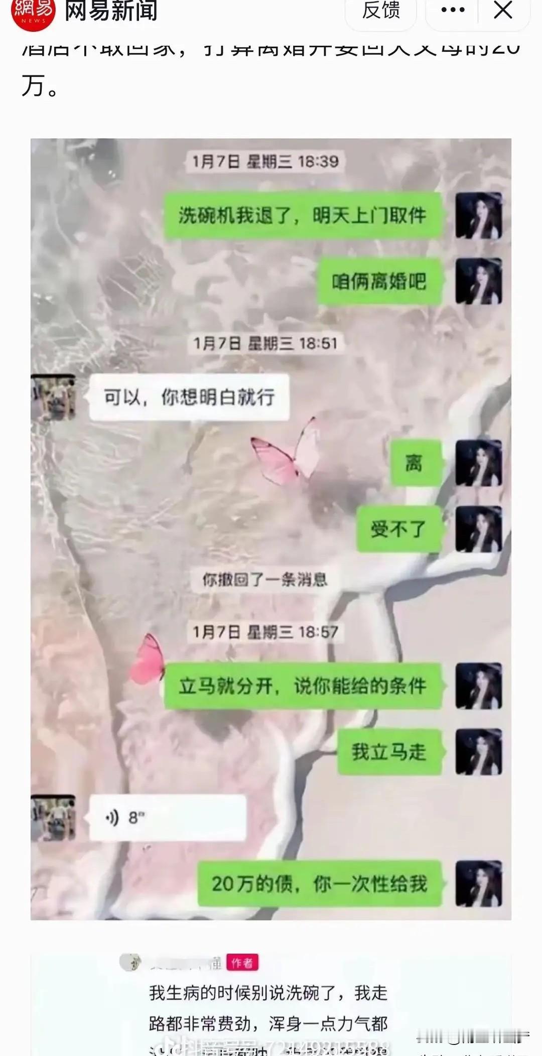 洗碗机那事,怕啥来啥——俩人要散了。 女子住宾馆第四天,曝出来的聊天记录里,她提离婚,男的应了。 这事儿打从1月7号就炸了锅:她偷买洗碗机,他把家砸了。一开始网友都骂男的暴躁,直到她自己说透家底——男的一个人挣一万养四口,她病了一年多没上班,租着房,还欠着债,就因为冬天水凉不想洗碗,没商量就买了洗碗机。 评论区立马反过来了:一个人扛着家,上有老下有小,一万块够填多少窟窿?不想洗碗,可日子不是光靠耍性子过的。 再看那被砸的家,冰箱镜子都好好的,就地上碎了只碗,杂物撒了一地——分明是憋着劲没下狠手,情绪崩了,却还留着余地。她拦着不让砸洗碗机,他也没碰她一根手指头,连脏话都没飙过。 可现在,男的始终没出声,就一句“同意离婚”。 俩孩子还小,债还没清,就为台洗碗机闹到这步。说真的,能过就各退一步,日子是熬出来的;真要是三观拧不到一块,散了也别耽误孩子。 只是这结局,谁看了都得叹口气——好好的家,咋就被台洗碗机拆了呢?