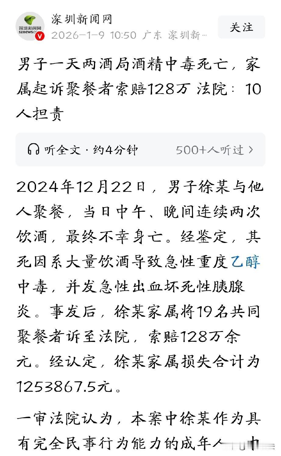 “举杯是朋友,倒下成债主!”男子中午参加朋友聚会,酒局上推杯换盏,喝了不少。散场后还觉不尽兴,晚上又参加了第二场酒局。万万没想到,因为大量饮酒,男子急性重度乙醇中毒,并发急性出血坏死性胰腺炎,不幸去世。年纪轻轻人就走了,家属悲痛欲绝,一气之下,将19名共同聚餐者全都告上法庭,索赔128万余元。 2024年12月22日,徐某去朋友伍某家聚餐。大家许久未见,非常热情,午饭时间,推杯换盏,徐某高兴,更是敞开了肚皮喝。 第一场酒局结束后,徐某还觉得不尽兴,晚上又接着来了第二场。 这顿晚饭是杨某组织的,桌上还有好些中午没一起喝过的人,像李某、王某、汤某、肖某和旷某红,他们和徐某都是第一次见面。 中午一起喝过的尹某、钟某和伍某也来了,不过他们三人晚饭没喝完就先走了。 中午的酒劲儿还没完全过去,本来应该好好休息的,但徐某死要面子,想着朋友们难得聚一次,不喝也太不给面子了。 于是,他就又没控制住自己,继续一杯接一杯地喝。 后来他醉意明显,结束后,李某玖看他醉得厉害,没送他回家,也没联系他家人,就把他安置在车上睡觉,之后也没再去查看情况。 谁能想到,就这么连续两场酒喝下来,徐某的身体扛不住了,最后不幸去世。 经过鉴定,徐某的死因是大量饮酒导致急性重度乙醇中毒,还并发了急性出血坏死性胰腺炎。 年纪轻轻的徐某本来是家里的顶梁柱,这一走,家里的天塌了一半,他们悲痛之余满是气愤。 他们觉得,徐某出去聚餐喝酒,一起吃饭的那些人都有责任,要不是他们劝酒,徐某也不会喝成这样。 于是,徐某家属一气之下,把当天一起聚餐的19个人都告上了法院,要求他们赔偿128万余元。 法院经过调查审理,经过认定,徐某家属的损失合计为1253867.5元。 《民法典》第1165条规定:行为人因过错侵害他人民事权益造成损害的,应当承担侵权责任。依照法律规定推定行为人有过错,其不能证明自己没有过错的,应当承担侵权责任。 一审法院认为,徐某作为具有完全民事行为能力的成年人,中午和晚间连续两次喝酒,都没控制住自己,结果大量饮酒后丢了性命。 所以,对于这个死亡后果和相关的损失,徐某自己承担70%的主要责任。 尹某和钟某,他们既是中餐也是晚餐的共饮者,虽然晚餐的时候提前走了,但他们明明知道徐某中午已经喝过酒了,两次喝酒间隔时间又短,应该能预料到中午和晚上连续喝会让徐某更快醉酒。 所以,这俩人得承担中午和晚上共饮行为之后的照看义务,各承担3%的责任。 还有李某玖,徐某喝醉后,他没把徐某送回家,也没通知家属,更没采取任何保护措施,就把徐某放在车上睡觉,具有明显有过错,承担9%的责任。 晚餐的共饮者李某、王某、汤某、肖某、旷某红,他们和徐某是初次相识。 不过喝酒结束后,徐某已经有很明显醉意了,他们作为共饮者,没尽到徐某饮酒后的安全照看义务,也有一定过错,各承担1%的责任。 伍某是中餐的组织者,也是共饮者,虽然他也提前离开了,但他明明知道中午徐某喝了酒,就得承担中餐组织者后续的安全保障义务,承担4%的责任。 杨某是晚餐组织者,同时也是中餐和晚餐的共饮者。他明明知道徐某中午喝了酒,还组织晚餐又接着喝,和徐某的死亡有直接因果关系,承担6%的责任。 其余人不存在过错,徐某家属要求他们承担责任没有法律依据,不予支持。 最后,法院判决:李某玖赔偿112848.08元;杨某赔偿75232.05元;伍某赔偿50154.7元;尹某赔偿37616.03元;钟某赔偿37616.03元;李某赔偿12538.67元;王某赔偿12538.67元;汤某赔偿12538.67元;肖某赔偿12538.67元;旷某红赔偿12538.67元。 何某自愿补偿1000元;陈某自愿补偿2000元;赵某自愿补偿2000元;廖某生自愿补偿2000元;饭店经营者某乙自愿补偿10000元。 一审判决下来后,伍某和钟某不服气,再次提起上诉,二审法院维持原判。