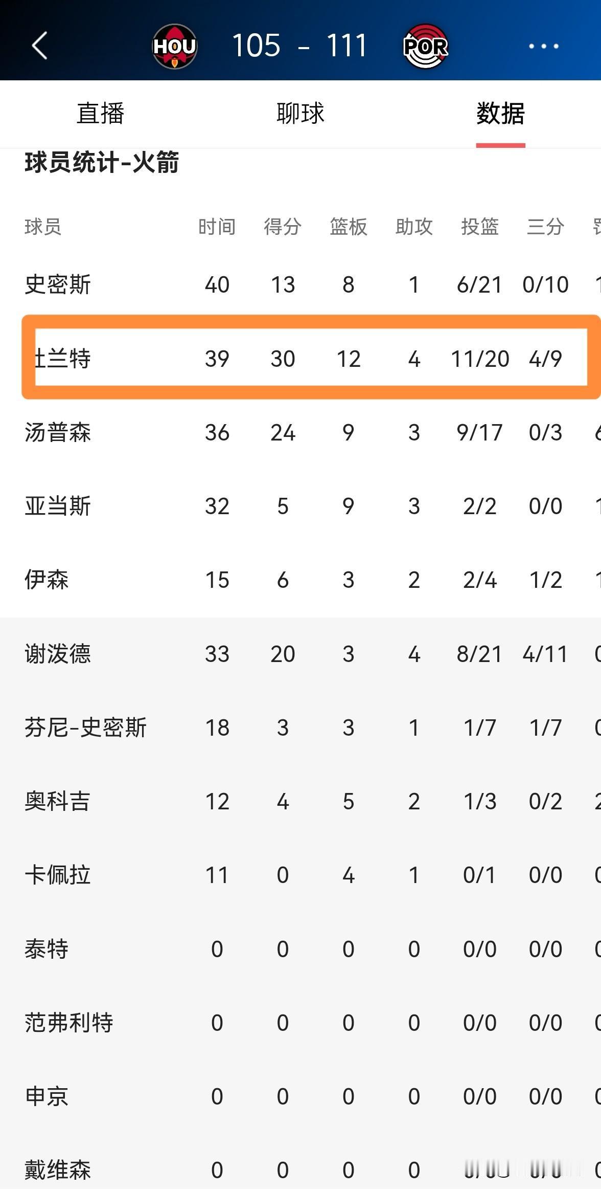 火箭老将杜兰特真是心里苦呀!今天火箭在客场以105:111不敌开拓者,连续两场比赛输给了对手。本场比赛,杜兰特首发出战39分钟,投篮20中11,其中三分球9中4、罚球4中4非常高效的砍下30分,还有12篮板4助攻2盖帽,他的场上正负值为+5。 虽然杜兰特的表现一如既往的出色,但是他的心里真是太苦了,因为他的身旁全是一群带不动的铁匠,其中包括小史密斯、谢波德、芬尼-史密斯和奥科吉。